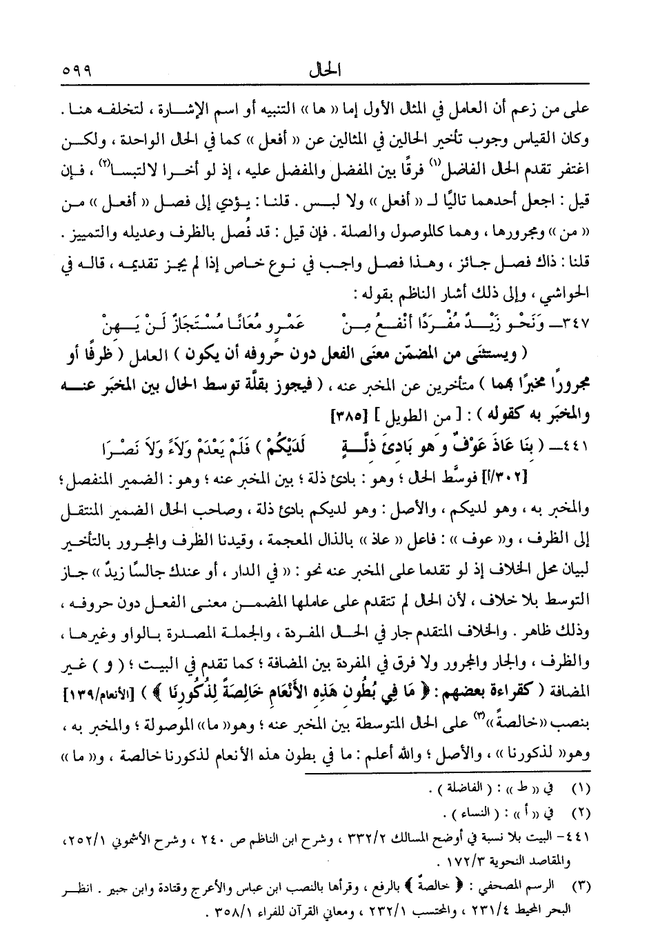فوسط الحال؛ وهو: بادئ ذلة؛ بين المخبر عنه؛ وهو: الضمير المنفصل؛ والمخبر به، وهو لديكم، والأصل: وهو لديكم بادئ ذلة؛ وصاحب الحال الضمير المنتقل إلى الظرف، و"عوف": فاعل "عاذ" بالذال المعجمة، وقيدنا الظرف والمجرور بالتأخير لبيان محل الخلاف إذ لو تقدما على المخبر عنه نحو: "في الدار، أو عندك جالسًا زيد" جاز التوسط بلا خلاف؛ لأن الحال لم تتقدم على عاملها المضمن معنى الفعل دون حروفه، وذلك ظاهر. والخلاف المتقدم جار في الحال المفردة، والجملة المصدرة بالواو وغيرها، والظرف، والجار والمجرور ولا فرق في المفردة بين المضافة؛ كما تقدم في البيت؛ "و" غير المضافة "كقراءة بعضهم: "مَا فِي بُطُونِ هَذِهِ الْأَنْعَامِ خَالِصَةً لِذُكُورِنَا"" [الأنعام: 139] بنصب "خالصة"3 على الحال المتوسطة بين المخبر عنه؛ وهو "ما" الموصولة؛ والمخبر به، وهو "لذكورنا"، والأصل؛ والله أعلم: ما في بطون هذه الأنعام لذكورنا خالصة، و"ما"