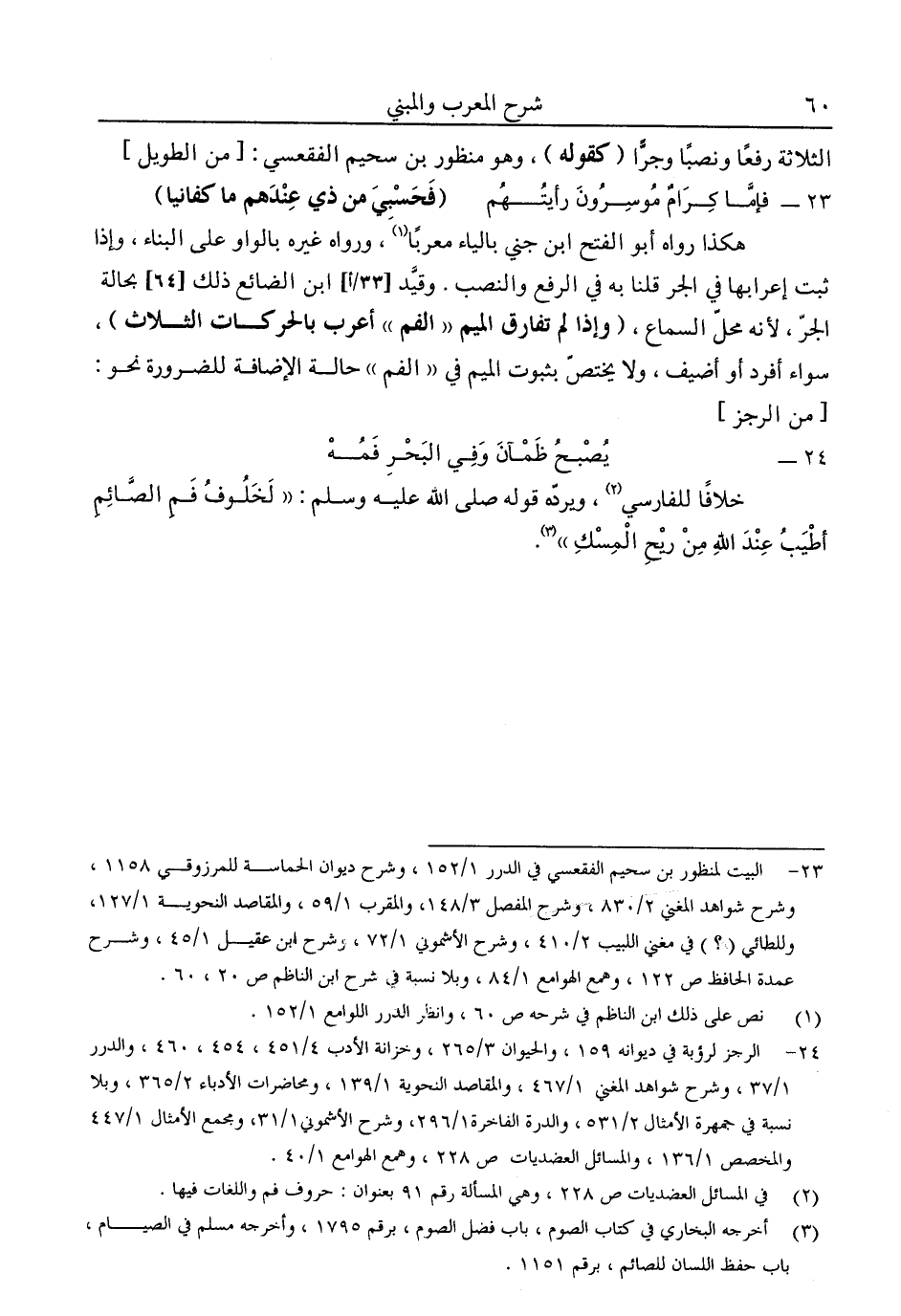 هكذا رواه أبو الفتح ابن جني بالياء معربا1، ورواه غيره بالواو على البناء، وإذا ثبت إعرابها في الجر قلنا به في الرفع والنصب. وقيد ابن الضائع ذلك بحالة الجر؛ لأنه محل السماع، "وإذا لم تفارق الميم "القم" أعرب بالحركات الثلاث"، سواء أفرد أو أضيف، ولا يختص بثبوت الميم في "الفم" حالة الإضافة للضرورة نحو: [من الرجز]