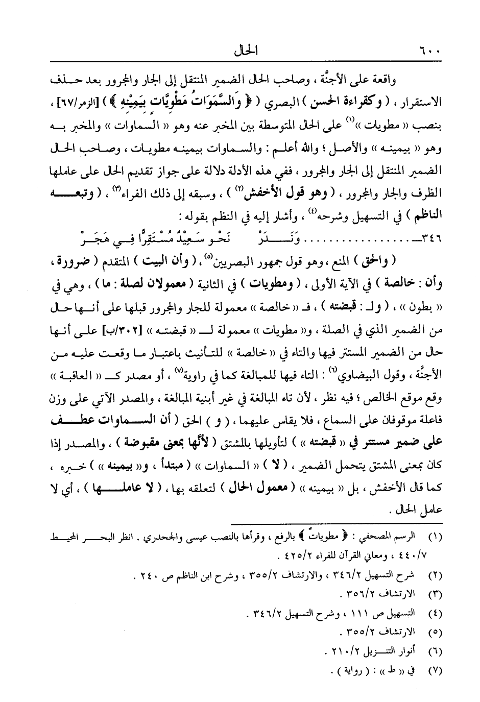 "والحق" المنع، وهو قول جمهور البصريين5، "وأن البيت" المتقدم "ضرورة وأن: خالصة" في الآية الأولى، "ومطويات" في الثانية "معمولان لصلة: ما"، وهي في "بطون"، "ولـ: قبضته"، فـ"خالصة" معمولة للجار والمجرور قبلها على أنها حال من الضمير الذي في الصلة: و"مطويات"، معمولة لـ"قبضته" على أنها حال من الضمير المستتر فيها والتاء في "خالصة" للتأنيث باعتبار ما وقعت عليه من الأجنة. وقول البيضاوي6: التاء فيها للمبالغة كما في رواية 7, أو مصدر كـ: "العاقبة"