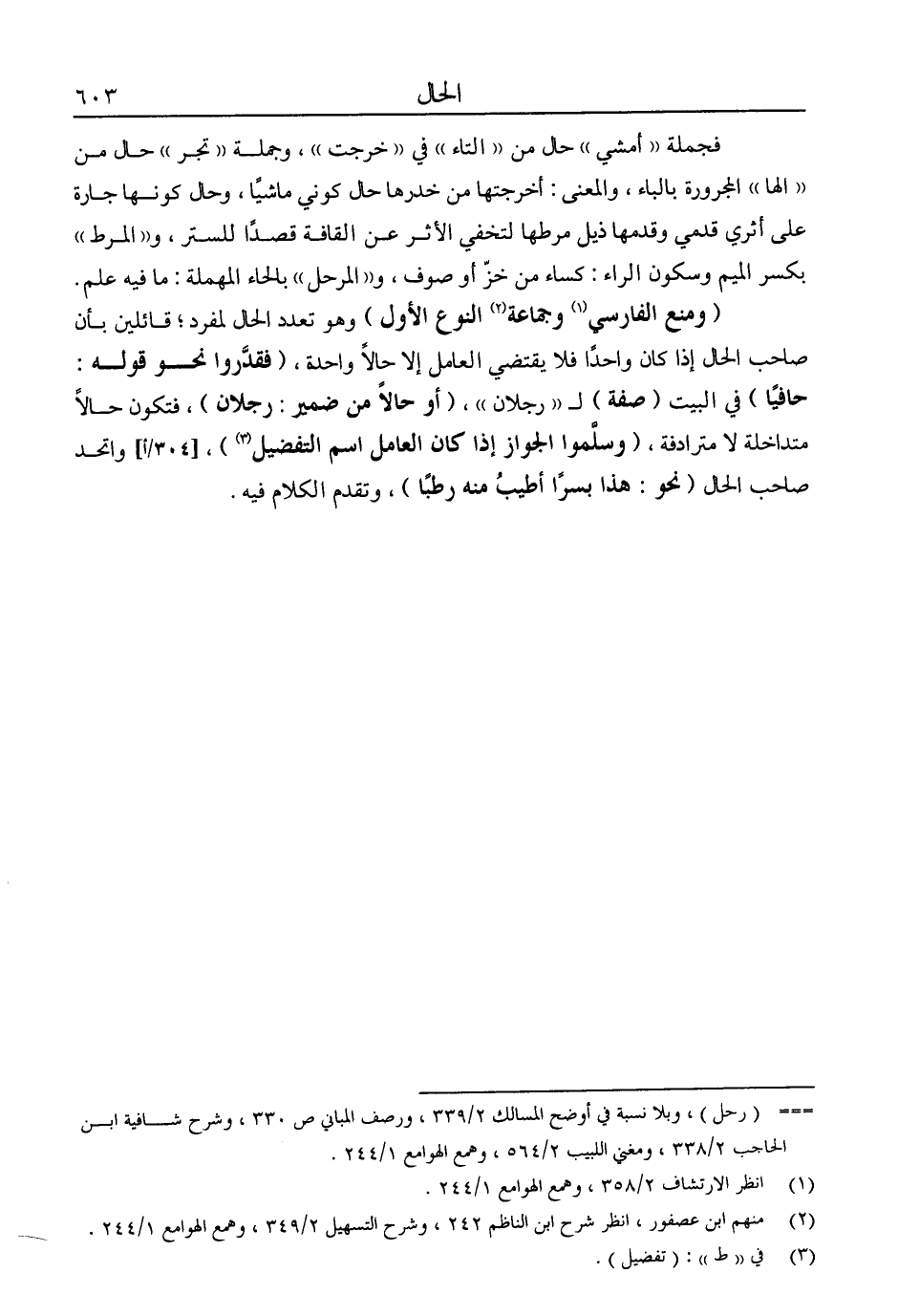 "ومنع الفارسي1 وجماعة2 النوع الأول" وهو تعدد الحال لمفرد؛ قائلين بأن صحاب الحال إذا كان واحدًا فلا يقتضي العامل إلا حالًا واحدة. "فقدروا نحو قوله: حافيًا" في البيت "صفة" لـ"رجلان"، "أو حالًا من ضمير: رجلان"، فتكون حالًا متداخلة لا مترادفة، "وسلموا الجواز إذا كان العامل اسم التفضيل3"، واتحد صاحب الحال "نحو: هذا بسرًا أطيب منه رطبًا"، وتقدم الكلام فيه.