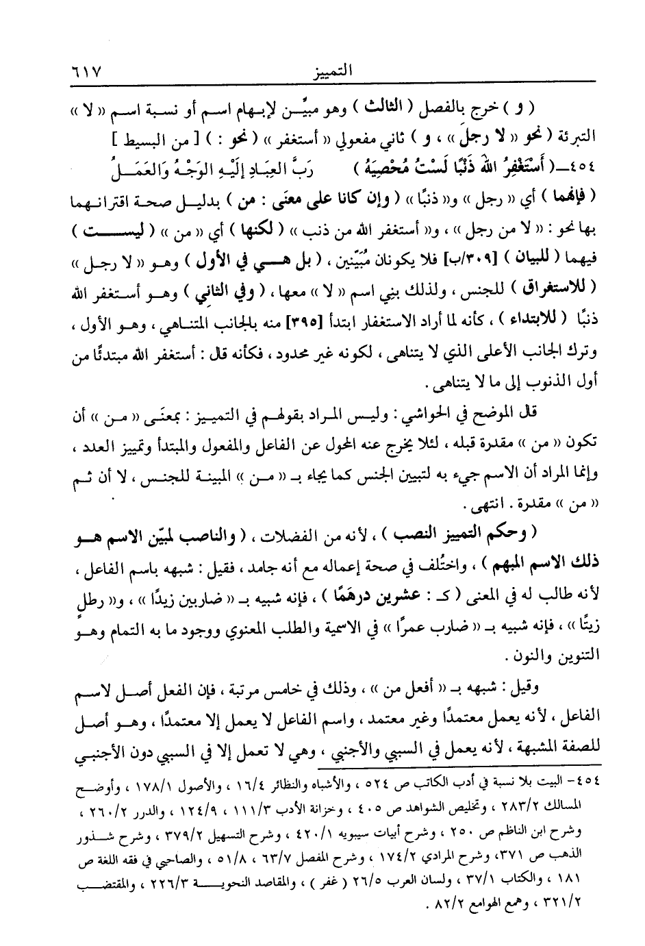 "و" خرج بالفصل "الثالث" وهو مبين لإبهام اسم أو نسبة اسم "لا" التبرئة "نحو: "لا رجل"، و" ثاني مفعولي "أستغفر" "نحو:" [من البسيط]