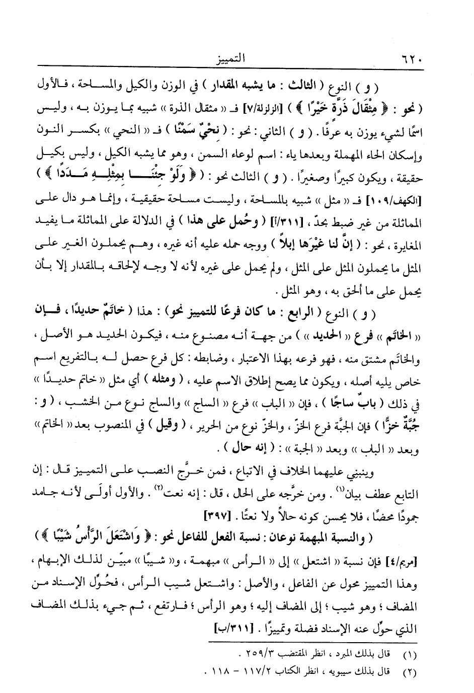 "و" النوع "الثالث: ما يشبه المقدار" في الوزن والكيل والمساحة، فالأول "نحو: {مِثْقَالَ ذَرَّةٍ خَيْرًا} [الزلزلة: 7] فـ"مثقال الذرة" شبيه بما يوزن به، وليس اسمًا لشيء يوزن به عرفًا. "و" الثاني: نحو: "نحي سمنا" فـ"النحي" بكسر النون وإسكان الحاء المهملة وبعدها ياء: اسم لوعاء السمن, وهو مما يشبه الكيل, وليس بكيل حقيقة, ويكون كبيرا وصغيرا. "و" الثالث نحو: " {وَلَوْ جِئْنَا بِمِثْلِهِ مَدَدًا} " [الكهف: 109] فـ"مثل" شبيه بالمساحة، وليست مساحة حقيقية، وإنما هو دال على المماثلة من غير ضبط بحد، "وحمل على هذا" في الدلالة على المماثلة ما يفيد المغايرة، نحو: "إن لنا غيرها إبلًا" ووجه حمله عليه أنه غيره، وهم يحملون الغير على المثل ما يحملون المثل على المثل، ولم يحمل على غيره؛ لأنه لا وجه لإلحاقه بالمقدار إلا بأن يحمل على ما ألحق به، وهو المثل.