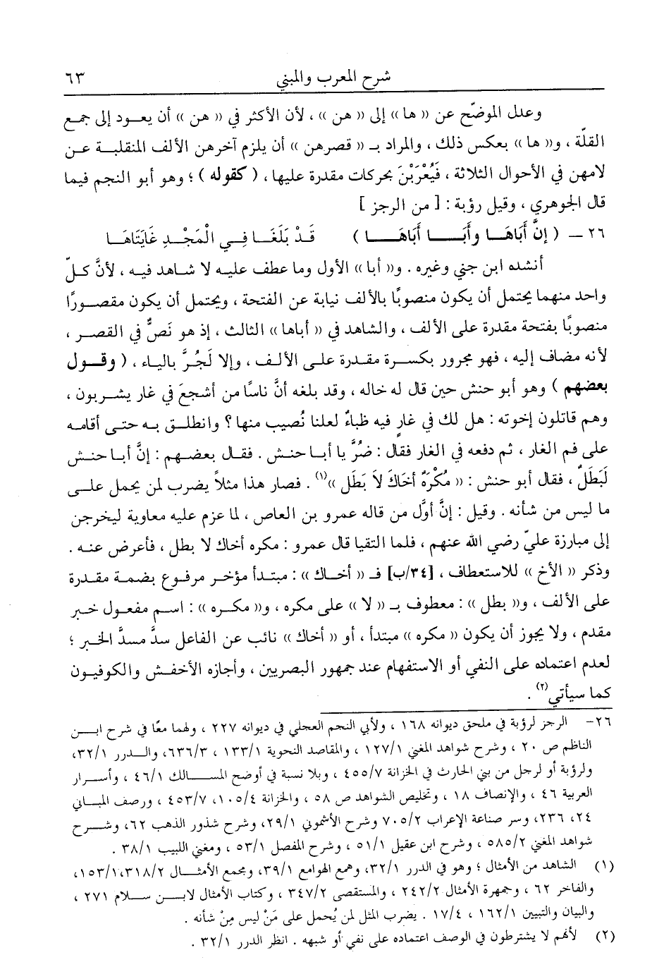 26- الرجز لرؤبة في ملحق ديوانه 168، ولأبي النجم العجلي في ديوانه 227، ولهما معا في شرح ابن الناظم ص20، وشرح شواهد المغني 1/ 127، والمقاصد النحوية 1/ 133، 3/ 636، والدرر 1/ 32، ولرؤبة أو لرجل من بني الحارث في الخزانة 7/ 455، وبلا نسبة في أوضح المسالك 1/ 46، وأسرار العربية 46، والإنصاف 18، وتخليص الشواهد ص58، والخزانة 4/ 105، 7/ 453، ورصف المباني 24، 236، وسر صناعة الإعراب 2/ 705 وشرح الأشموني 1/ 29، وشرح شذور الذهب 62، وشرح شواهد المغني 2/ 585، وشرح ابن عقيل 1/ 51، وشرح المفصل 1/ 53، ومغني اللبيب 1/ 38.