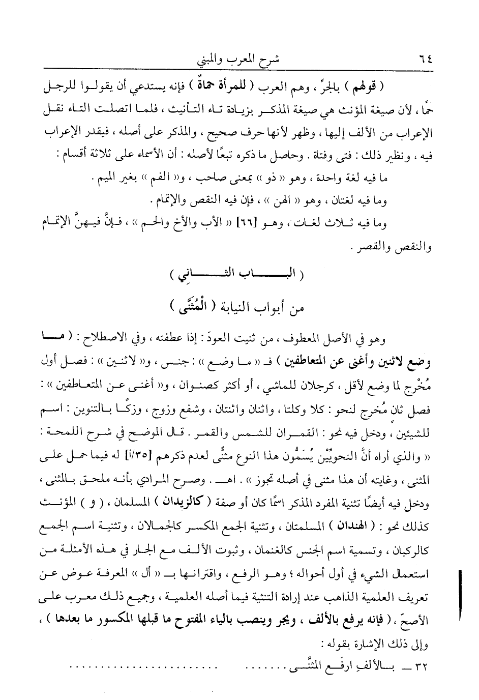 وهو في الأصل المعطوف، من ثنيت العود: إذا عطفته، وفي الاصطلاح: "ما وضع لاثنين وأغنى عن المتعاطفين" فـ"ما وضع": جنس، و"لاثنين": فصل أول مخرج لما وضع لأقل، كرجلان للماشي، أو أكثر كصنوان، و"أغنى عن المتعاطفين": فصل ثان مخرج لنحو: كلا وكلتا، واثنان واثنتان، وشفع وزوج، وزكًا بالتنوين: اسم للشيئين، ودخل فيه نحو: القمران للشمس والقمر. قال الموضح في شرح اللمحة: "والذي أراه أن النحويين يسمون هذا النوع مثنى لعدم ذكرهم له فيما حمل على المثنى، وغايته أن هذا مثنى في أصله تجوز". ا. هـ. وصرح المرادي بأنه ملحق بالمثنى، ودخل فيه أيضا تثنية المفرد المذكر اسما كان أو صفة "كالزيدان" المسلمان, "و" المؤنث كذلك نحو: "الهندان" المسلمتان، وتثنية الجمع المكسر كالجمالان، وتثنية اسم الجمع كالركبان، وتسمية اسم الجنس كالغنمان، وثبوت الألف مع الجار في هذه الأمثلة من استعمال الشيء في أول أحواله؛ وهو الرفع، واقترانها بـ"أل" المعرفة عوض عن تعريف العلمية الذاهب عند إرادة التثنية فيما أصله العلمية، وجميع ذلك معرب على الأصح، "فإنه يرفع بالألف، ويجر وينصب بالياء المفتوح ما قبلها المكسور ما بعدها"، وإلى ذلك الإشارة بقوله: