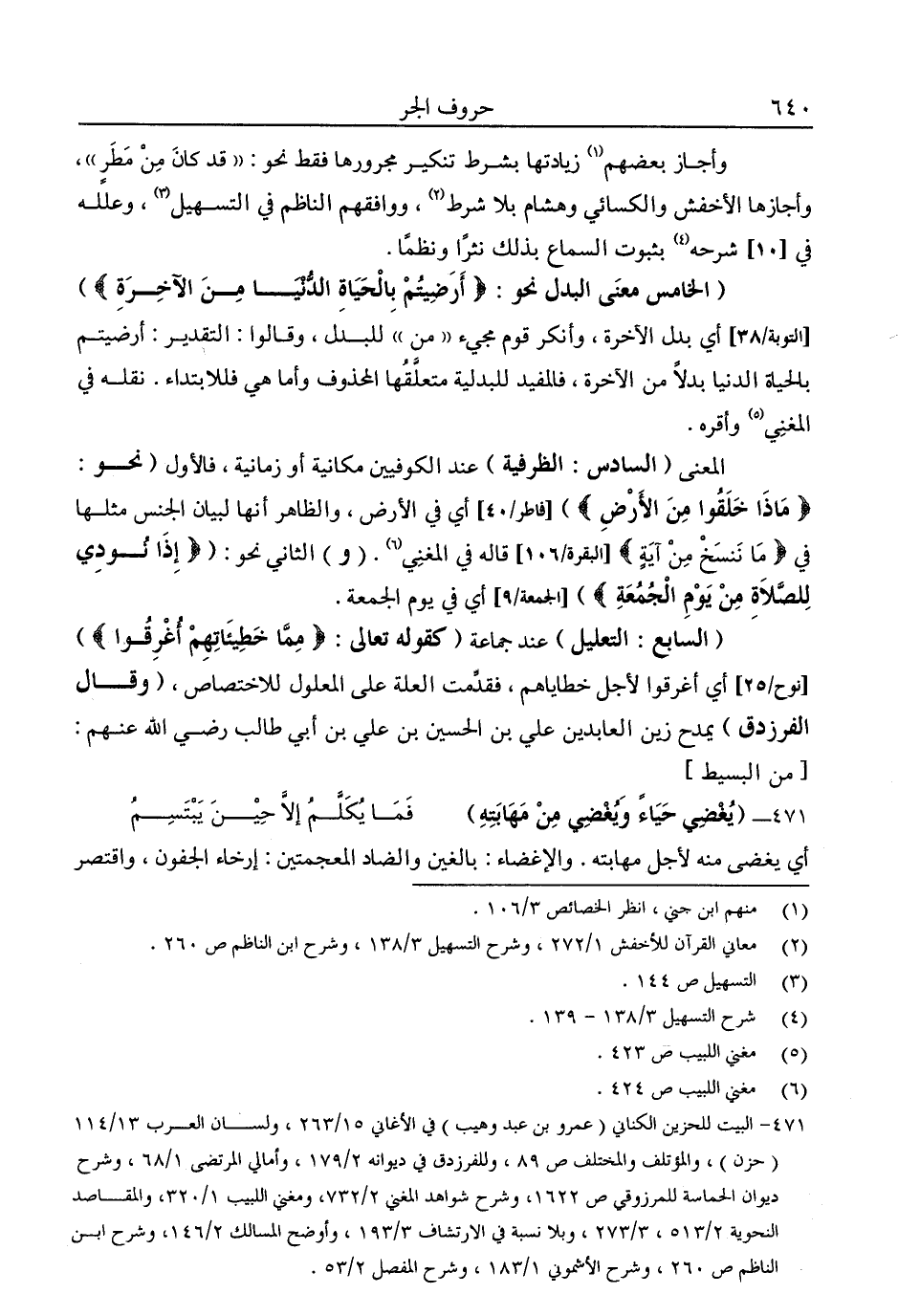 المعنى "السادس: الظرفية" عند الكوفيين مكانية أو زمانية، فالأول "نحو: {مَاذَا خَلَقُوا مِنَ الْأَرْضِ} " [فاطر: 40] أي: في الأرض، والظاهر أنها لبيان الجنس مثلها في {مَا نَنْسَخْ مِنْ آيَةٍ} [البقرة: 106] قاله في المغني6. "و" الثاني نحو: " {إِذَا نُودِيَ لِلصَّلَاةِ مِنْ يَوْمِ الْجُمُعَةِ} " [الجمعة: 9] أي: في يوم الجمعة.