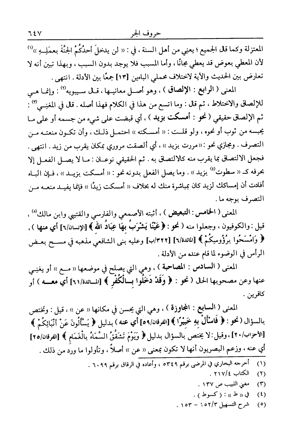 المعنى "الخامس: التبعيض"، أثبته الأصمعي والفارسي والقتيبي وابن مالك5، قيل: والكوفيون، وجعلوا منه "نحو: {عَيْنًا يَشْرَبُ بِهَا عِبَادُ اللَّهِ} [الإنسان: 6] أي: منها"، {وَامْسَحُوا بِرُءُوسِكُمْ} [المائدة: 6] وعليه بنى الشافعي مذهبه في مسح بعض الرأس في الوضوء لما قام عنده من الأدلة.