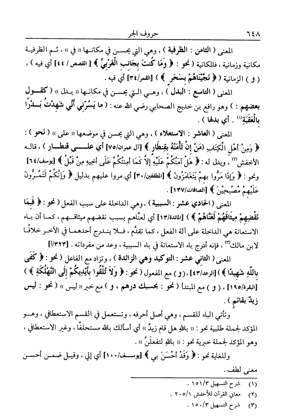 المعنى "الثامن: الظرفية"، وهي التي يحسن في مكانها "في"، ثم الظرفية مكانية وزمانية، فالمكانية، "نحو: {وَمَا كُنْتَ بِجَانِبِ الْغَرْبِيِّ} [القصص: 44] أي: فيه"، "و" الزمانية " {نَجَّيْنَاهُمْ بِسَحَرٍ} " [القمر: 34] أي: فيه.