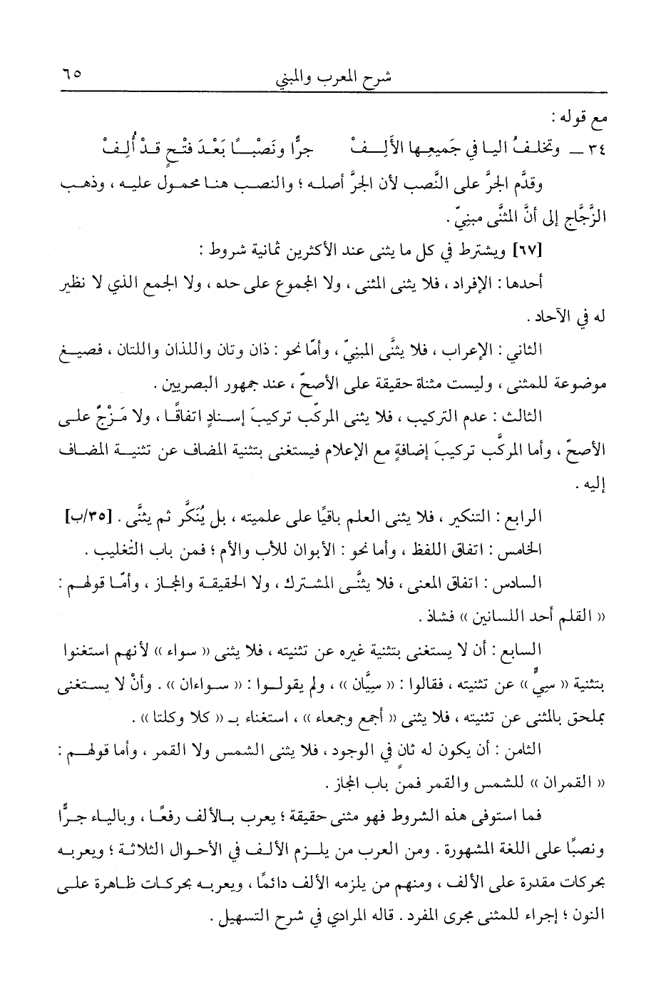 فما استوفى هذه الشروط فهو مثنى حقيقة؛ يعرب بالألف رفعا، وبالياء جرا ونصبا على اللغة المشهورة. ومن العرب من يلزم الألف في الأحوال الثلاثة؛ ويعربه بحركات مقدرة على الألف، ومنهم من يلزمه الألف دائما، ويعربه بحركات ظاهرة على النون؛ إجراء للمثنى مجرى المفرد، قاله المرادي في شرح التسهيل.