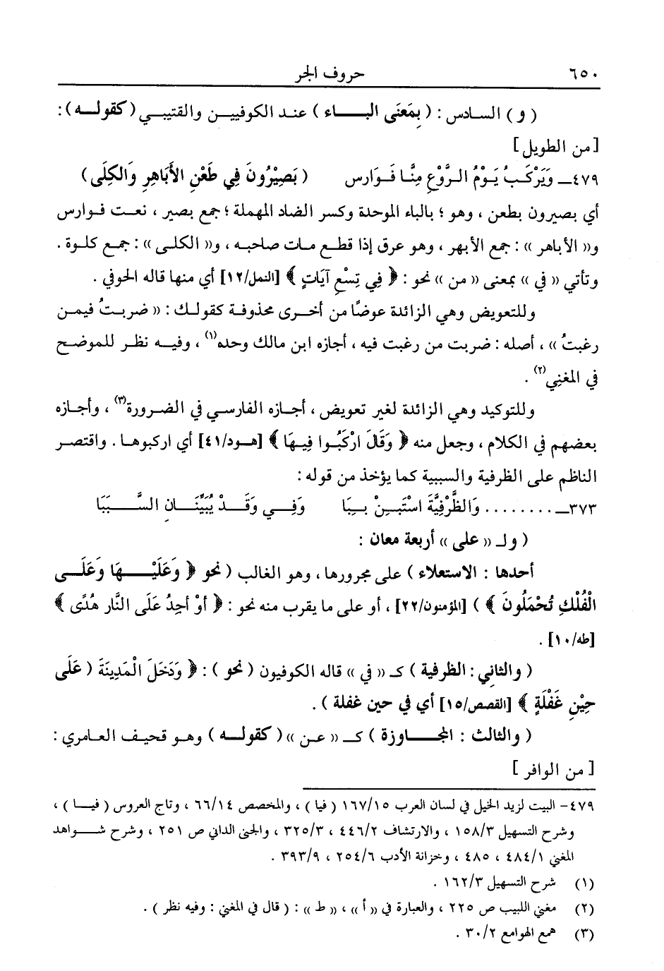 وللتوكيد وهي الزائدة لغير تعويض، وأجازه الفارسي في الضرورة3، وأجازه بعضهم في الكلام، وجعل منه {وَقَالَ ارْكَبُوا فِيهَا} [هود: 41] أي: اركبوها. واقتصر الناظم على الظرفية والسببية كما يؤخذ من قوله: