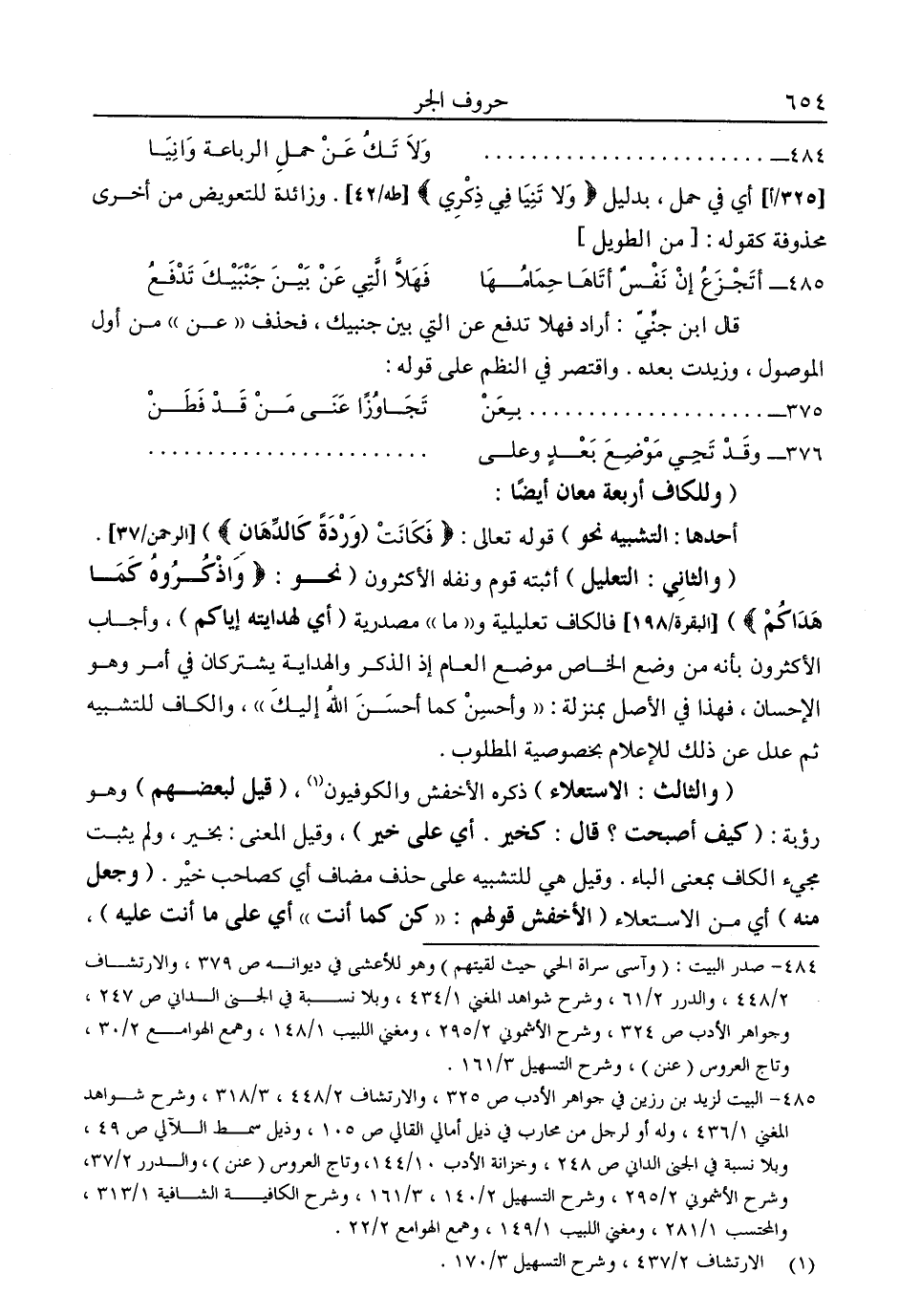 "والثاني: التعليل" أثبته قوم ونفاه الأكثرون "نحو: {وَاذْكُرُوهُ كَمَا هَدَاكُمْ} " [البقرة: 198] فالكاف تعليلية و"ما" مصدرية "أي: لهدايته إياكم". وأجاب الأكثرون بأنه من وضع الخاص موضع العام إذا الذكر والهداية يشتركان في أمر وهو الإحسان. فهذا في الأصل بمنزلة: "وأحسن كما أحسن الله إليك"، والكاف للتشبيه ثم عدل عن ذلك للإعلام بخصوصية المطلوب.