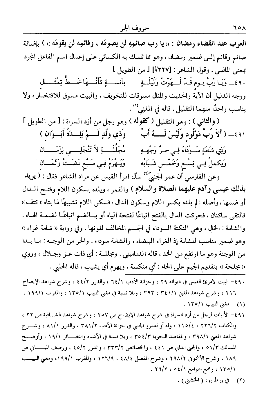 وعن الفارسي أن عمر الجنبي2 سأل امرأ القيس عن مراد الشاعر فقال: "يريد بذلك عيسى وآدم عليهما الصلاة والسلام" والقمر، ويلده بسكون اللام وفتح الدال أو ضمها، وأصله: لم يلده بكسر اللام وسكون الدال, فسكن اللام تشبيهًا لها بتاء "كتف" فالتقى ساكنان، فحركت الدال بالفح اتباعًا لفتحة الياء أو بالضم اتباعًا لضمة الهاء. والشامة: الخال، وهي النكتة السوداء في الجسم المخالف للونها. وفي رواية "شامة غراء" وهو ضمير مناسب للشامة إذا الغراء البيضاء. والشامة سوداء. والحر من الوجه: ما بدا من الوجنة وهو ما ارتفع من الخد، قاله الدماميني. ومجللة: أي: ذات عز وجلال، وروي "مجلحة" بتقديم الجيم على الخاء: أي: منكسة، ويهرم أي: يشيب، قاله الحلبي.