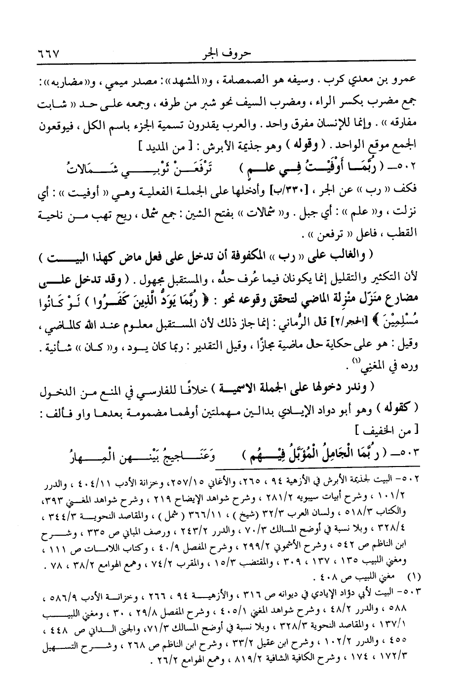 "والغالب على "رب" المكفوفة أن تدخل على فعل ماض كهذا البيت" لأن التكثير والتقليل إنما يكونان فيما عرف حده، والمستقبل مجهول، "وقد تدخل على مضارع منزل منزلة الماضي لتحقق وقوعه نحو: {رُبَمَا يَوَدُّ الَّذِينَ كَفَرُوا " لَوْ كَانُوا مُسْلِمِينَ} [الحجر: 2] قال الرماني: إنما جاز ذلك لأن المستقبل معلوم عند الله كالماضي, وقيل: هو على حكاية حال ماضية مجازا, وقيل التقدير: ربما كان يود، و"كان" شأنية.