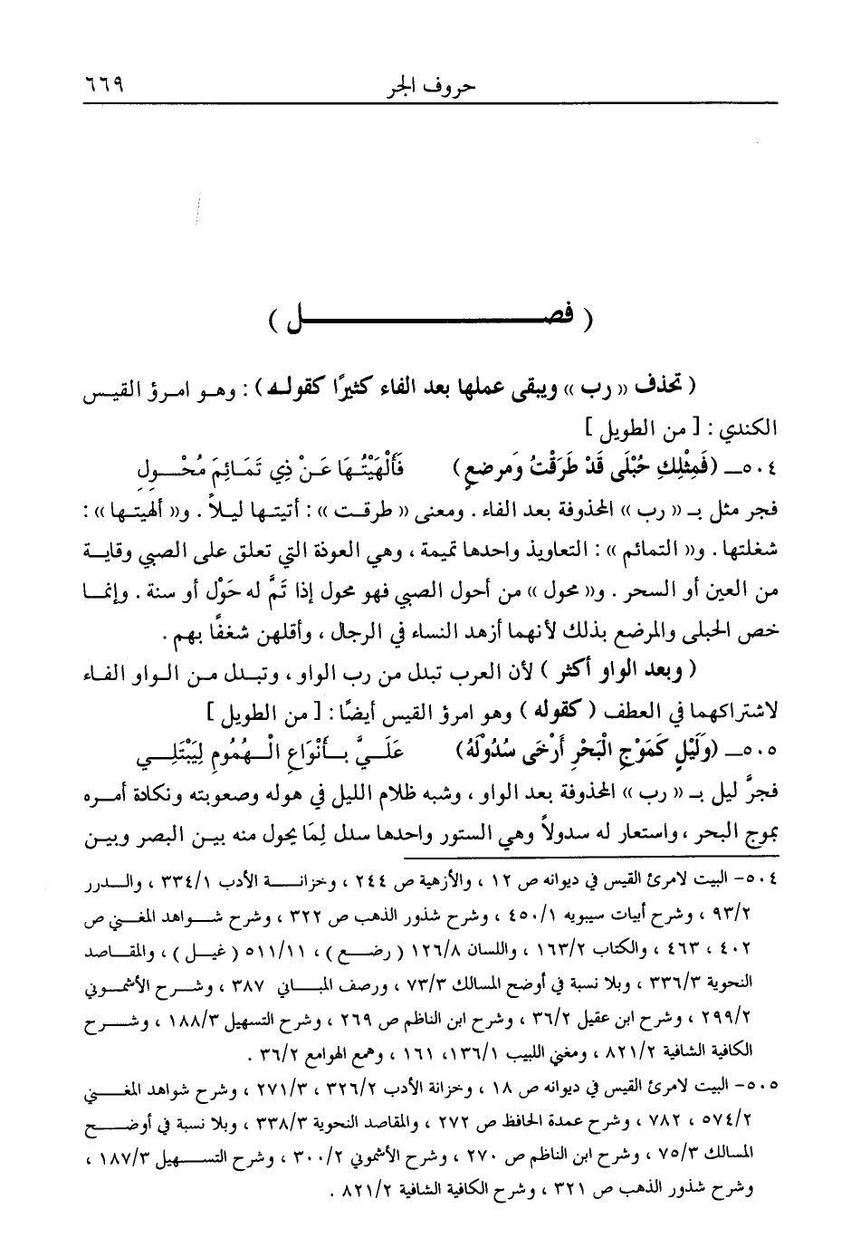 "تحذف "رب" ويبقى عملها بعد الفاء كثيرًا كقوله": وهو امرؤ القيس الكندي: [من الطويل]