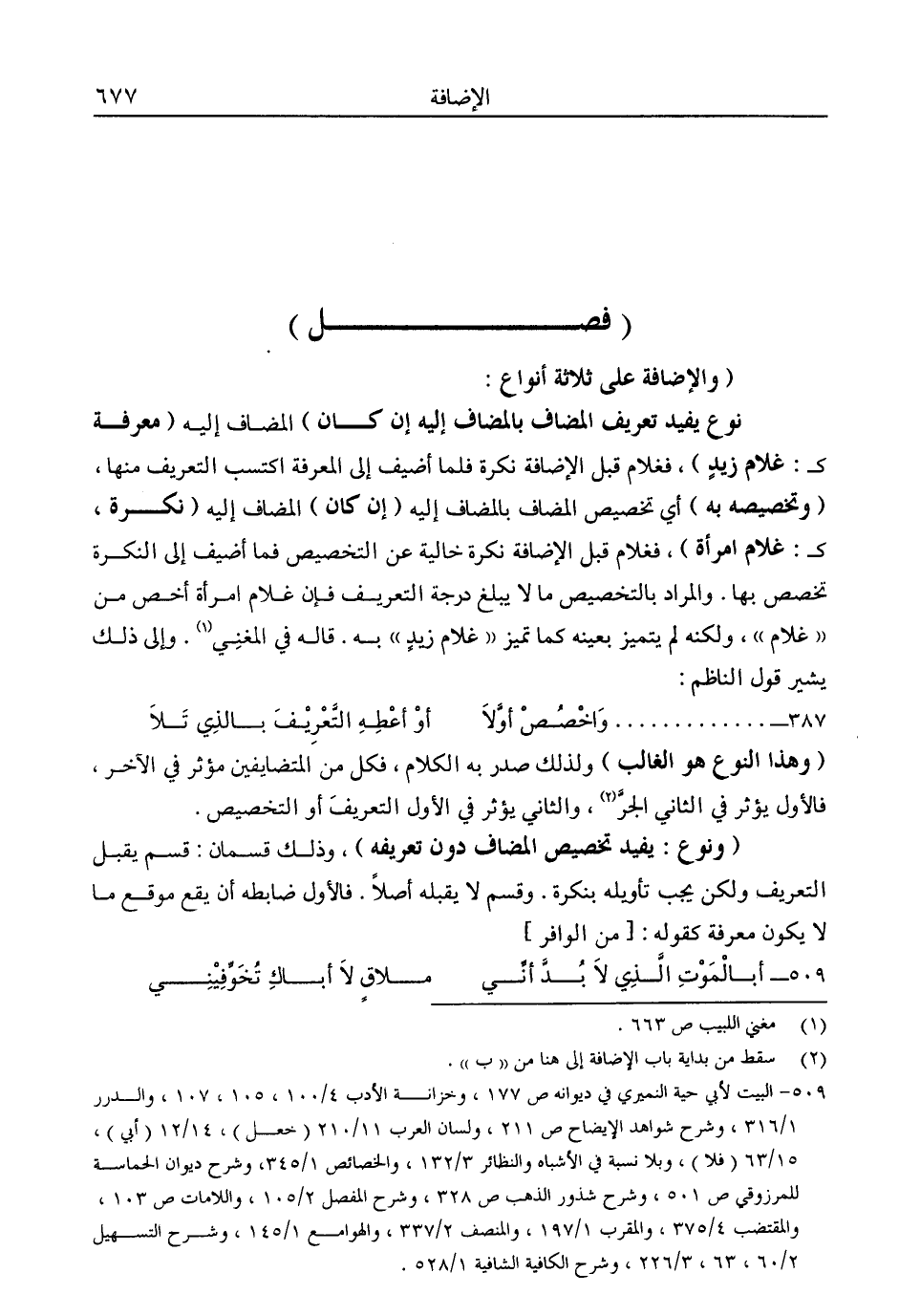 نوع يفيد تعريف المضاف بالمضاف إليه إن كان" المضاف إليه "معرفة كـ: غلام زيد"، فغلام قبل الإضافة نكرة فلما أضيف إلى المعرفة اكتسب التعريف منها، "وتخصيصه به" أي: تخصيص المضاف بالمضاف إليه "إن كان" المضاف إليه "نكرة كـ: غلام امرأة"، فغلام قبل الإضافة نكرة خالية عن التخصيص فما أضيف إلى النكرة تخصص بها. والمراد بالتخصيص ما لا يبلغ درجة التعريف فإن غلام امرأة أخص من "غلام"، ولكنه لم يتميز بعينه كما تميز "غلام زيد" به. قاله في المغني1. وإلى ذلك يشير قول الناظم: