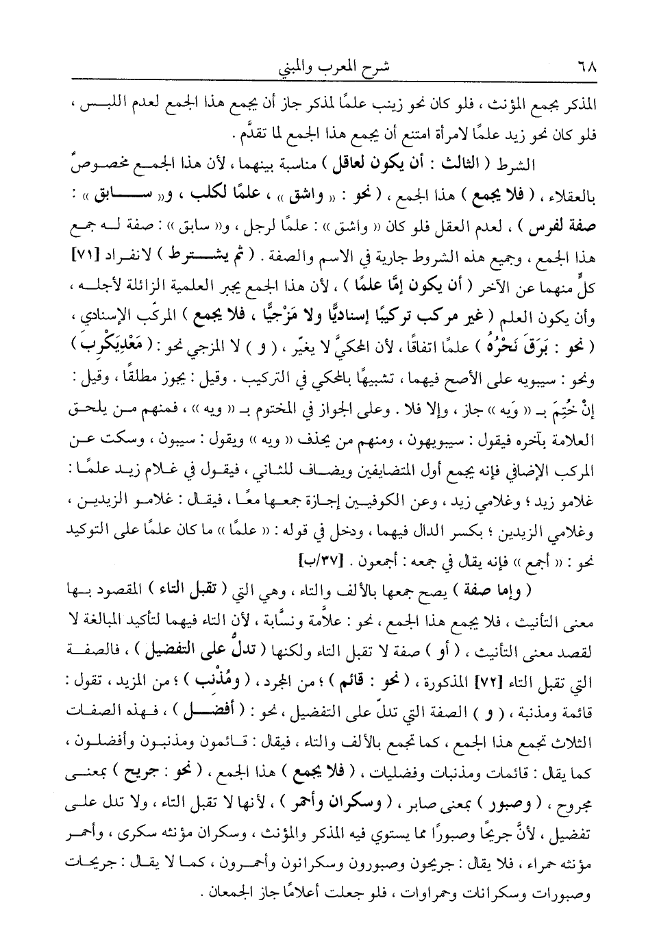 الشرط "الثالث: أن يكون لعاقل" مناسبة بينهما؛ لأن هذا الجمع مخصوص بالعقلاء، "فلا يجمع" هذا الجمع، "نحو: "واشق"، علما لكلب، و"سابق": صفة الفرس"، لعدم العقل فلو كان "واشق": علما لرجل، و"سابق": صفة له جمع هذا الجمع، وجميع هذه الشروط جارية في الاسم والصفة. "ثم يشترط" لانفراد كل منهما عن الآخر "أن يكون إما علما"؛ لأن هذا الجمع يجبر العلمية الزائلة لأجلة، وأن يكون العلم "غير مركب تركيبا إسناديا ولا مزجيا، فلا يجمع" المركب الإسنادي، "نحو: بَرَقَ نَحْرُهُ" علما اتفاقا؛ لأن المحكي لا يغير، "و" لا المزجي نحو: "معديكرب" ونحو: سيبويه على الأصح فيهما، تشبيها بالمحكي في التركيب. وقيل: يجوز مطلقا، وقيل: إن خُتِم بـ"ويه" جاز، وإلا فلا. وعلى الجواز في المختوم بـ"ويه"، فمنهم من يلحق العلامة بآخره فيقول: سيبويهون، ومنهم من يحذف "ويه" ويقول: سيبون، وسكت عن المركب الإضافي فإنه يجمع أول المتضايفين ويضاف للثاني، فيقول في غلام زيد علما: غلامو زيد؛ وغلامي زيد، وعن الكوفيين إجازة جمعها معا، فيقال: غلامو الزيدين، وغلامي الزيدين؛ بكسر الدال فيهما، ودخل في قوله: "علما" ما كان علما على التوكيد نحو: "أجمع" فإنه يقال في جمعه: أجمعون.