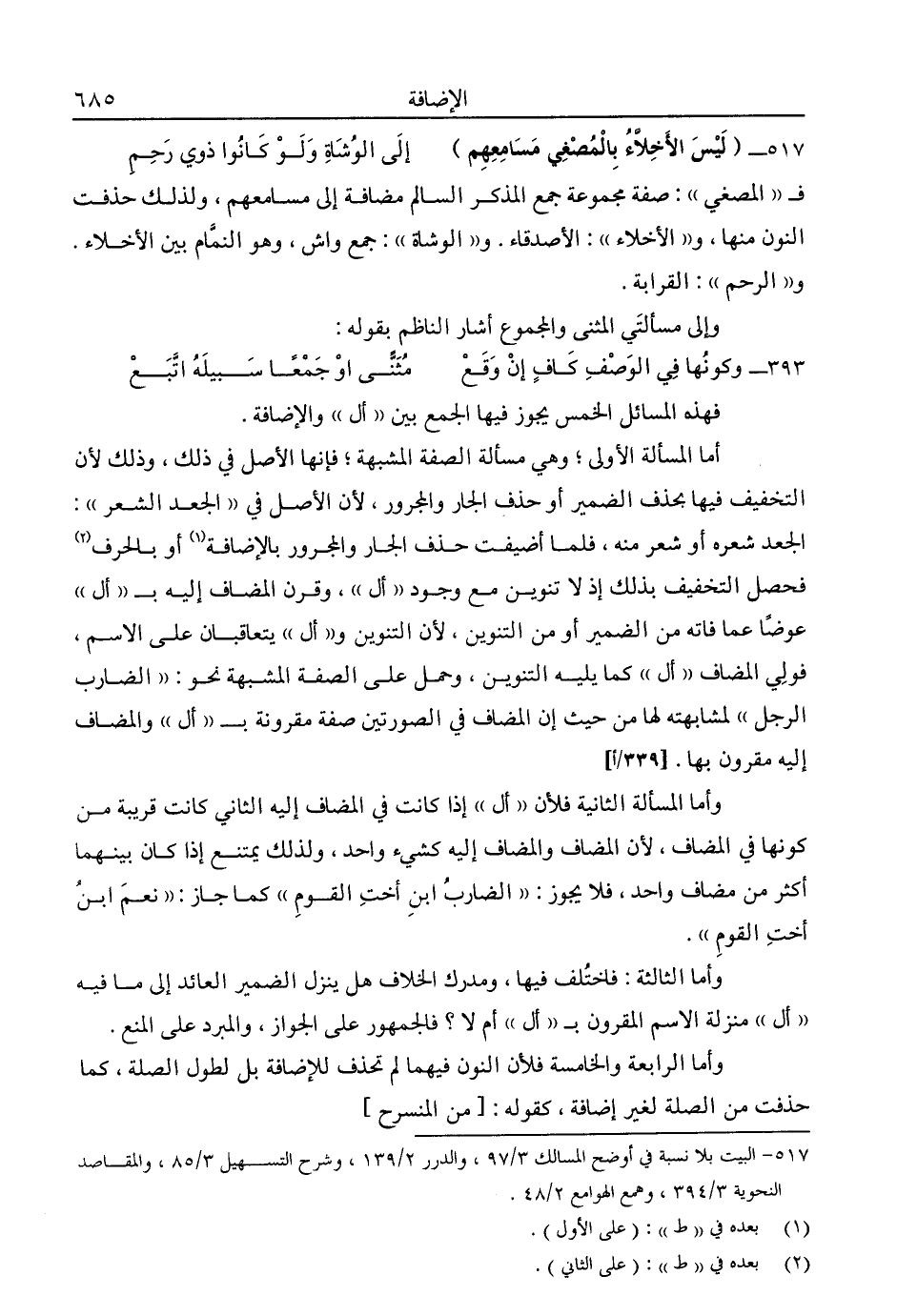وأما المسألة الثانية فلأن "أل" إذا كانت في المضاف إليه الثاني كانت قريبة من كونها في المضاف؛ لأن المضاف والمضاف إليه كشيء واحد، ولذلك يمتنع إذا كان بينهما أكثر من مضاف واحد، فلا يجوز: "الضارب ابن أخت القوم" كما جاز: "نعم ابن أخت القوم".