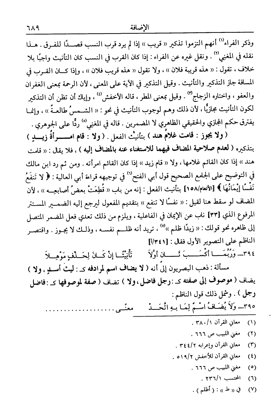 وذكر الفراء1 أنهم التزموا تذكير "قريب" إذا لم يرد قرب النسب قصدًا للفرق، هذا نقله في المغني2، ونقل غيره عن الفراء: إذا كان القرب في النسب كان التأنيث واجبًا بلا خلاف، تقول "هذه قريبة فلان"، ولا تقول "هذه قريب فلان"، وإذا كان القرب في المسافة التذكير والتأنيث، وقيل التذكير في الآية على المعنى؛ لأن الرحمة بمعنى الغفران والعفو، واختاره الزجاج3، وقيل بمعنى المطر قاله الأخفش4، وإياك أن تظن أن التذكير لكون التأنيث مجازيا؛ لأن ذلك وهم لوجوب التأنيث في نحو: "الشمس طالعة" وإنما يفترق حكم المجازي والحقيقي الظاهري لا المضمرين، قاله في المغني5 ردًا على الجوهري.