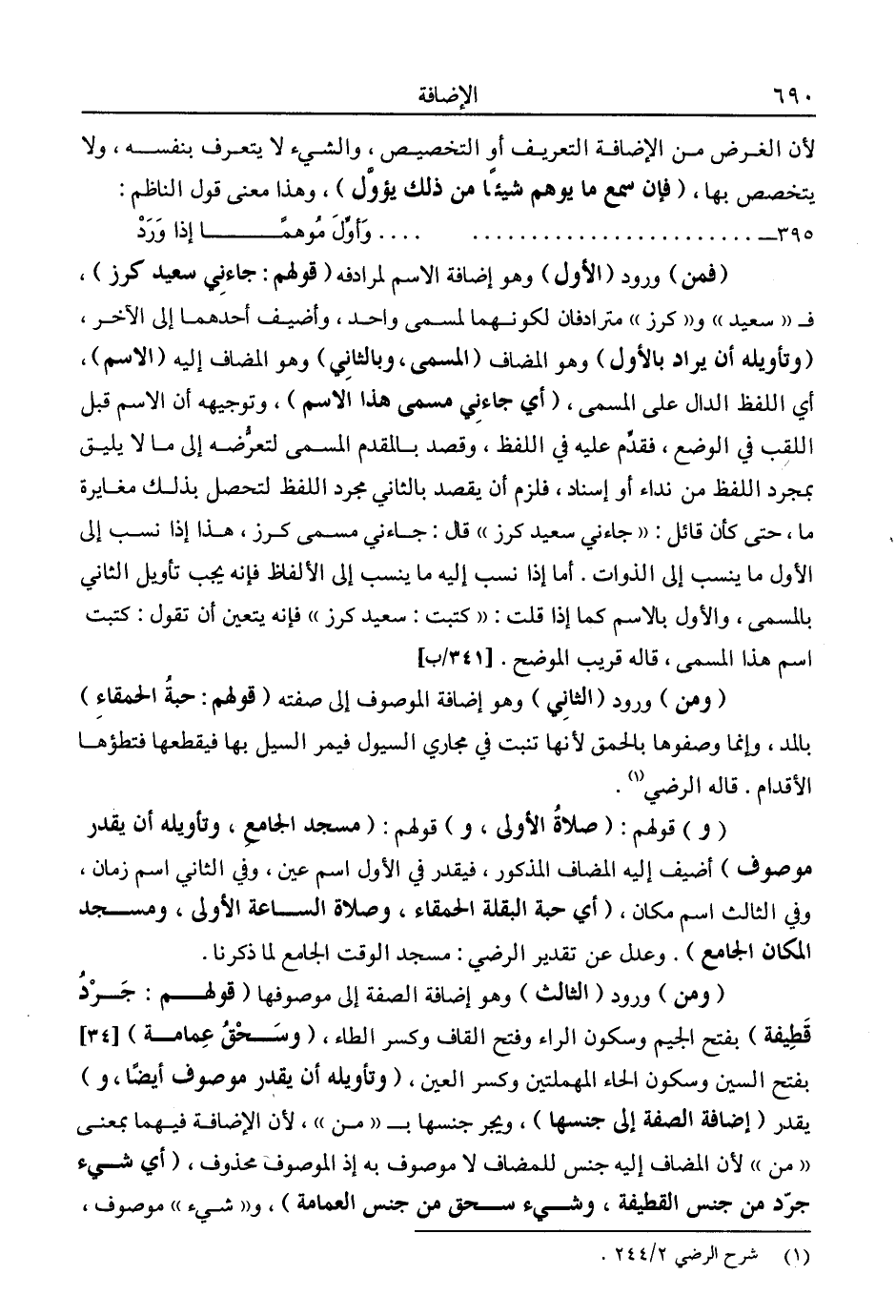 "و" قولهم: "صلاة الأولى، و" قولهم: "مسجد الجامع، وتأويله أن يقدر موصوف" أضيف إليه المضاف المذكور، فيقدر في الأول اسم عين، وفي الثاني اسم زمان، وفي الثالث اسم مكان، "أي: حبة البقلة الحمقاء، وصلاة الساعة الأولى، ومسجد المكان الجامع"، وعدل عن تقدير الرضي: مسجد الوقت الجامع لما ذكرنا.