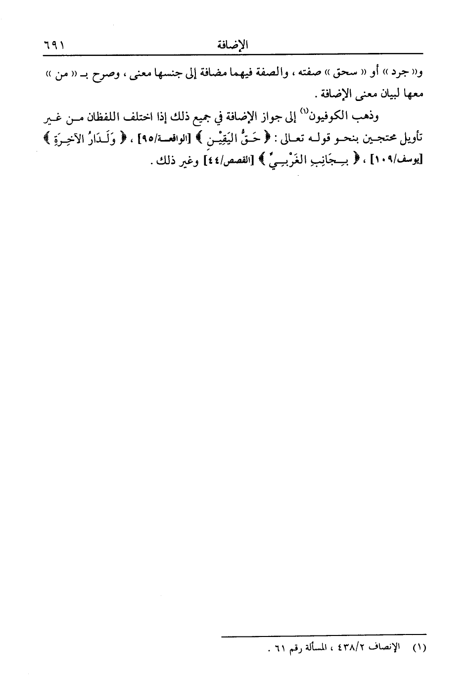 وذهب الكوفيون1 إلى جواز الإضافة في جميع ذلك إذا اختلف اللفظان من غير تأويل محتجين بنحو قوله تعالى: {حَقُّ الْيَقِينِ} [الواقعة: 95] ، {وَلَدَارُ الْآخِرَةِ} [يوسف: 109] ، {بِجَانِبِ الْغَرْبِيِّ} [القص: 44] وغير ذلك.