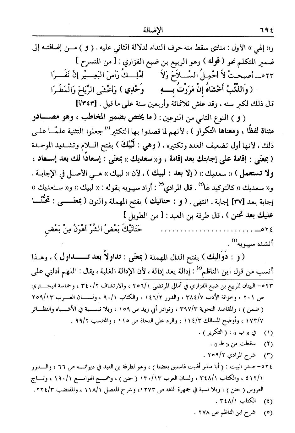 و"سعديك" كالتوكيد لها2، قال المرادي3: أراد سيبويه بقوله: "لبيك" و"سعديك" إجابة بعد إجابة، ا. هـ. "و: حنانيك" بفتح المهملة والنون "بمعنى: تحننا عليك بعد تحنن"، قاله طرفة بن العبد: [من الطويل]