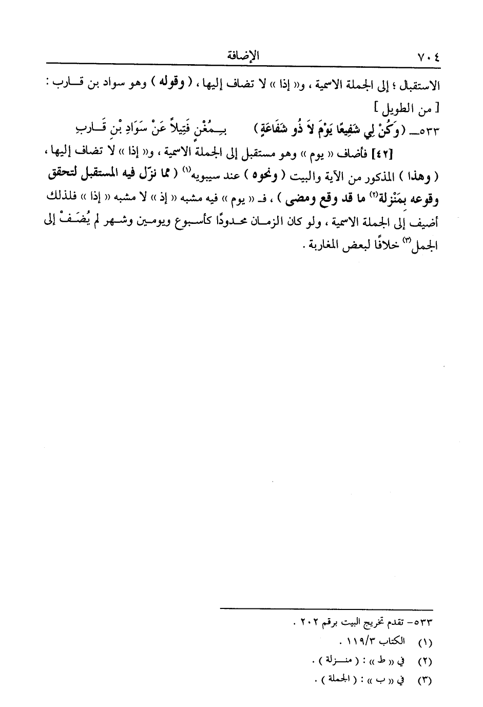 فأضاف "يوم" وهو مستقبل إلى الجملة الاسمية، و"إذا" لا تضاف إليها، و"هذا" المذكور من الآية والبيت "ونحوه" عند سيبويه1 "مما نزل فيه المستقبل لتحقق وقوعه بمنزلة2 ما قد وقع ومضى"، فـ"يوم" فيه مشبه "إذ" لا مشبه "إذا" فلذلك أضيف إلى الجملة الاسمية، ولو كان الزمان محدودًا كأسبوع ويومين وشهر لم يضف إلى الجمل3 خلافًا لبعض المغاربة.