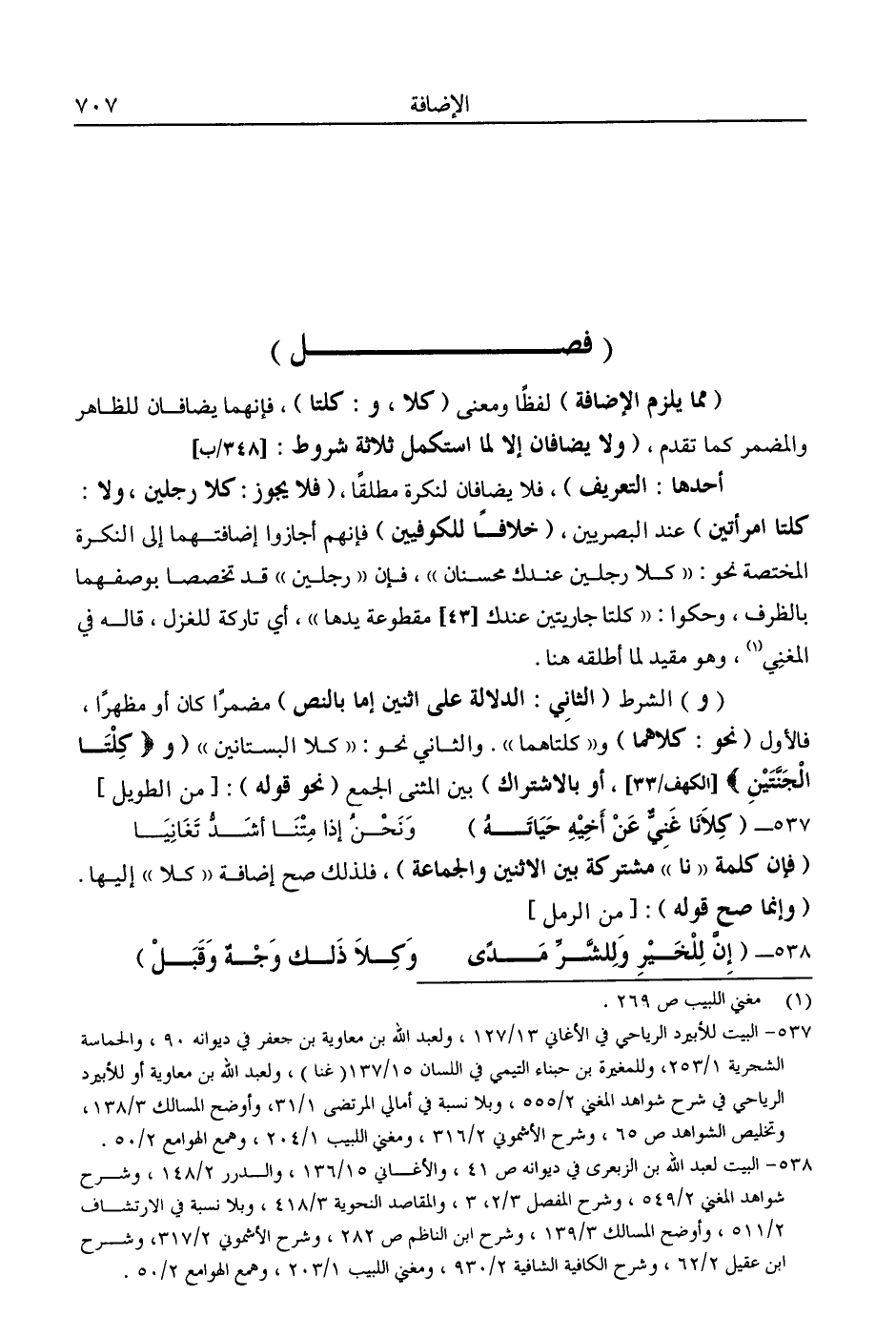 "مما يلزم الإضافة" لفظًا ومعنى "كلا، و: كلتا"، فإنهما يضافان للظاهر والمضمر كما تقدم، "ولا يضافان إلا لما استكمل ثلاثة شروط: