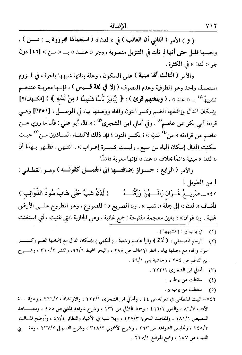 "و" الأمر "الثاني أن الغالب" في "لدن" "استعمالها مجرورة بـ: من"، ونصبها قليل حتى إنها لم تأت في التنزيل منصوبة، وجر "عند" بـ"من" دون جر "لدن" في الكثرة.