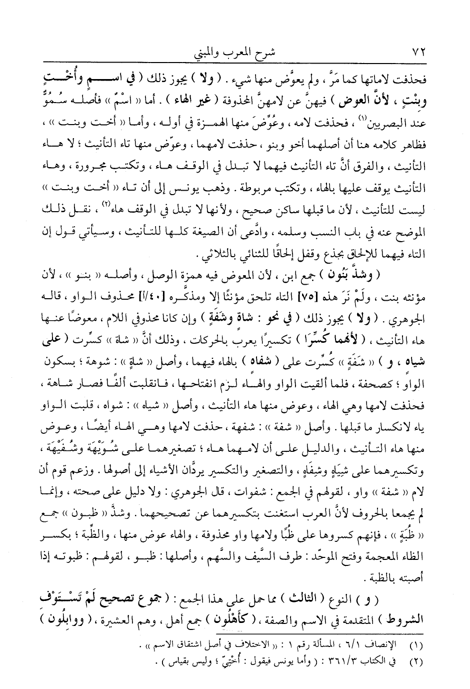 "وشذ بنون" جمع ابن؛ لأن المعوض فيه همزة الوصل، وأصله "بنو"؛ لأن مؤنثه بنت، ولم نر هذه التاء تلحق مؤنثا إلا ومذكره محذوف الواو، قاله الجوهري. "ولا" يجوز ذلك "في نحو: شاة وشفة" وإن كانا محذوفي اللام، معوضا عنها هاء التأنيث؛ "لأنهما كسرا" تكسيرا يعرب بالحركات، وذلك أن "شاة" كسرت "على شياه، و" "شفة" كسرت على "شفاه" بالهاء فيهما، وأصل "شاة": شوهة؛ بسكون الواو؛ كصفحة، فلما ألقيت الواو والهاء لزم انفتاحها، فانقلبت ألفا فصار شاهة، فحذفت لامها وهي الهاء، وعوض منها هاء التأنيث، وأصل "شياه": شواه، قبلت الواو ياء لانكسار ما قبلها. وأصل "شفة": شفهة، حذفت لامها وهي الهاء أيضا، وعوض منها هاء التأنيث، والدليل على أن لامهما هاء؛ تصغيرهما على شويهة وشفيهة، وتكسيرهما على شياه وشفاه، والتصغير والتكسير يردان الأشياء إلى أصولها. وزعم قوم أن لام "شفة" واو، لقولهم في الجمع: شفوات، قال الجوهري: ولا دليل على صحته، إنما لم يجمعا بالحروف؛ لأن العرب استغنت بتكسيرهما عن تصحيحهما. وشذ "ظبون" جمع "ظبة"، فإنهم كسروها على ظُبا ولامها واو محذوفة، والهاء عوض منها، والظبة؛ بكسر الظاء المعجمة وفتح الموحد: طرف السيف والسهم، وأصلها: ظبو، لقولهم: ظبوته إذا أصبته بالظبة.