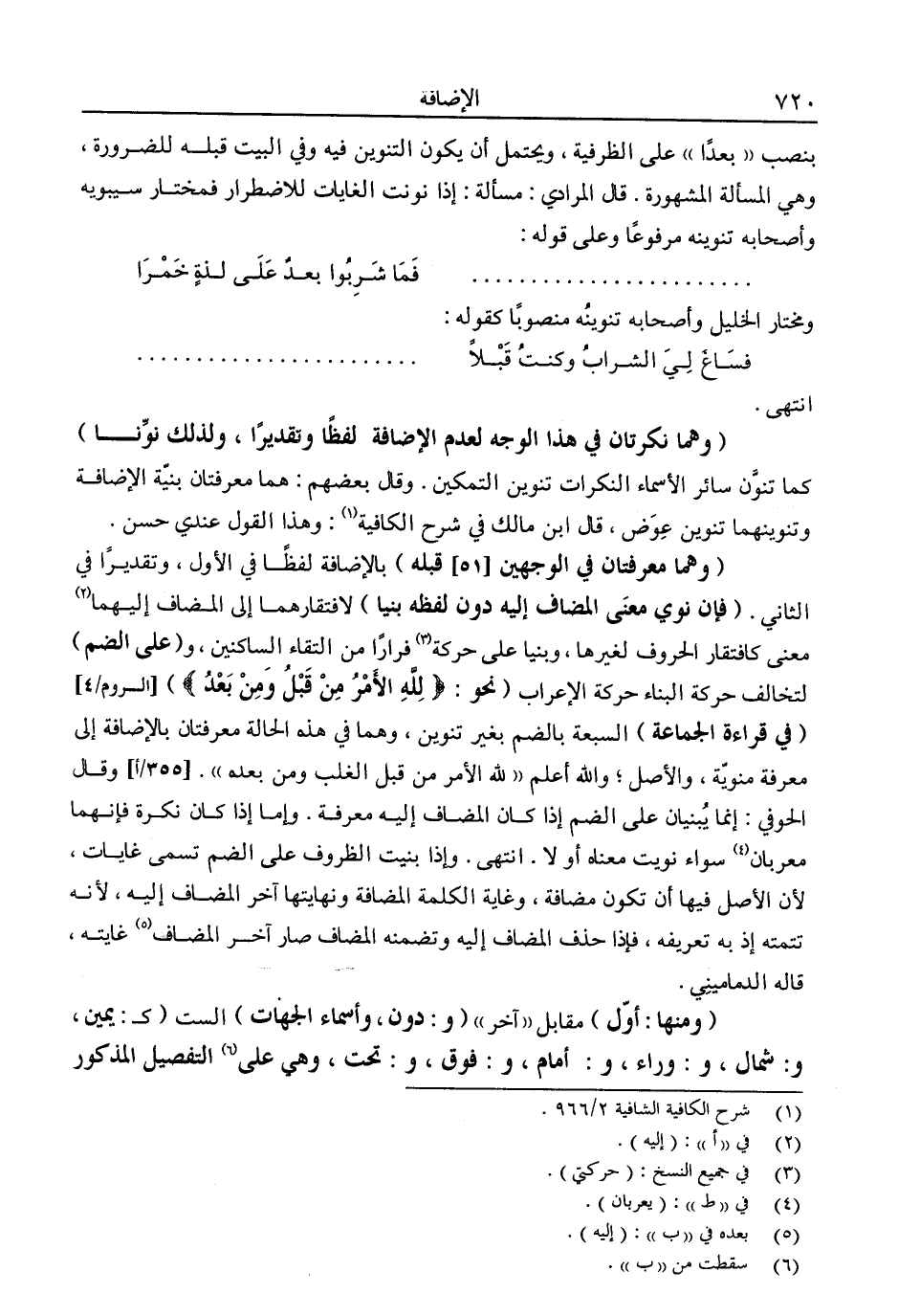 "ومنها: أول" مقابل "آخر" "و: دون، وأسماء الجهات" الست "كـ: يمين، و: شمال، و: وراء، و: أمام، و: فوق، و: تحت، وهي على6 التفصيل المذكور