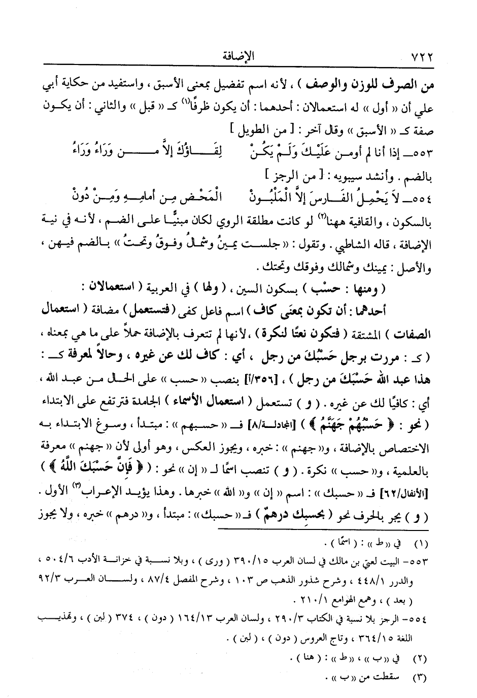 أحدهما: أن تكون بمعنى كاف" اسم فاعل كفى "فتستعمل" مضافة "استعمال الصفات" المشتقة "فتكون نعتًا لنكرة"؛ لأنها لم تتعرف بالإضافة حملًا على ما هي بمعناه، "كـ: مررت برجل حسبك من رجل، أي: كاف لك من غيره وحالًا لمعرفة كـ: هذا عبد الله حسبك من رجل"، بنصب "حسب" على الحال من عبد الله، أي: كافيا لك من غيره، "و" تستعمل "استعمال الأسماء" الجامدة فترتفع على الابتداء "نحو: {حَسْبُهُمْ جَهَنَّمُ} [المجادلة: 8] فـ"حسبهم": مبتدأ، وسوغ الابتداء به الاختصاص بالإضافة، و"جهنم": خبره، ويجوز العكس، وهو أولى لأن "جهنم" معرفة بالعلمية، "وحسب" نكرة، "و" تنصب اسمًا لـ"إن" نحو: " {فَإِنَّ حَسْبَكَ اللَّهُ} " [الأنفال: 62] فـ"حسبك": اسم "إن" و"الله" خبرها، وهذا يؤيد الإعراب3 الأول.