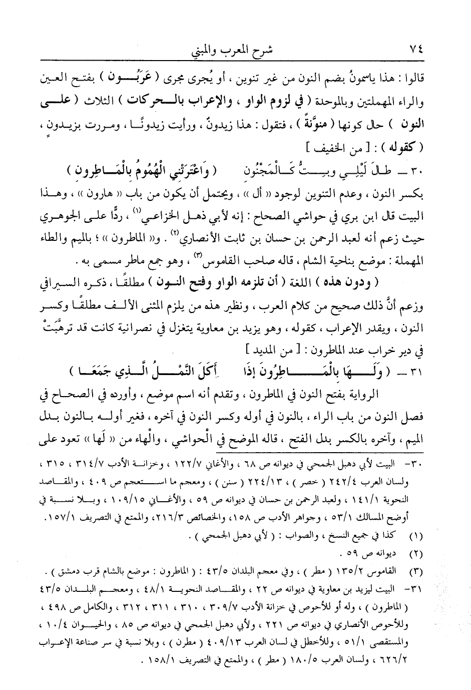 31- البيت ليزيد بن معاوية في ديوانه ص22، والمقاصد النحوية 1/ 48، ومعجم البلدان 5/ 43 "الماطرون"، وله أو للأحوص في خزانة الأدب 7/ 309، 310، 311، 312، والكامل ص498، وللأحوص الأنصاري في ديوانه ص221، ولأبي دهبل الجمحي في ديوانه ص85، والحيوان 4/ 10، والمستقصى 1/ 51، وللأخطل في لسان العرب 13/ 409 "مطرن"، وبلا نسبة في سر صناعة الإعراب 2/ 626، ولسان العرب 5/ 180 "مطر"، والممتع في التصريف 1/ 158.