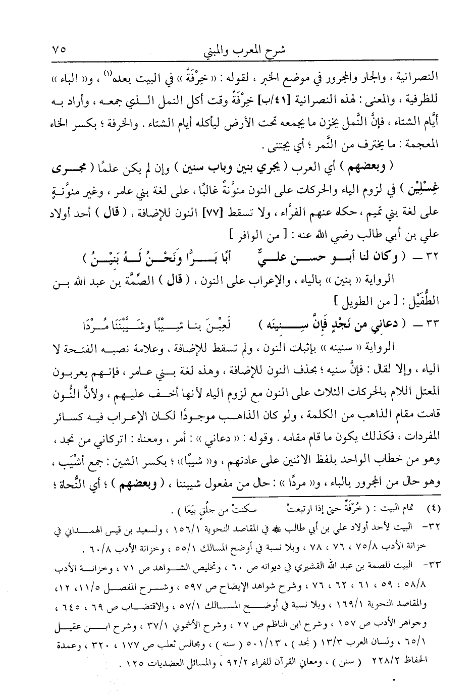 الرواية "سنينه" بإثبات النون، ولم تسقط للإضافة، وعلامة نصبه الفتحة لا الياء، وإلا لقال: فإن سنيه؛ بحذف النون للإضافة، وهذه لغة بني عامر، فإنهم يعربون المعتل اللام بالحركات الثلاث على النون مع لزوم الياء؛ لأنها أخف عليهم؛ ولأن النون قامت مقام الذاهب من الكلمة، ولو كان الذاهب موجودا لكان الإعراب فيه كسائر المفردات، فكذلك يكون ما قام مقامه. وقوله: "دعاني": أمر، ومعناه: اتركاني من نجد، وهو من خطاب الواحد بلفظ الاثنين على عادتهم، و"شيبا"؛ بكسر الشين: جمع أشيب، وهو حال من المجرور بالباء، و"مردا": حال من مفعول شيبننا، "وبعضهم"؛ أي: النحاة؛