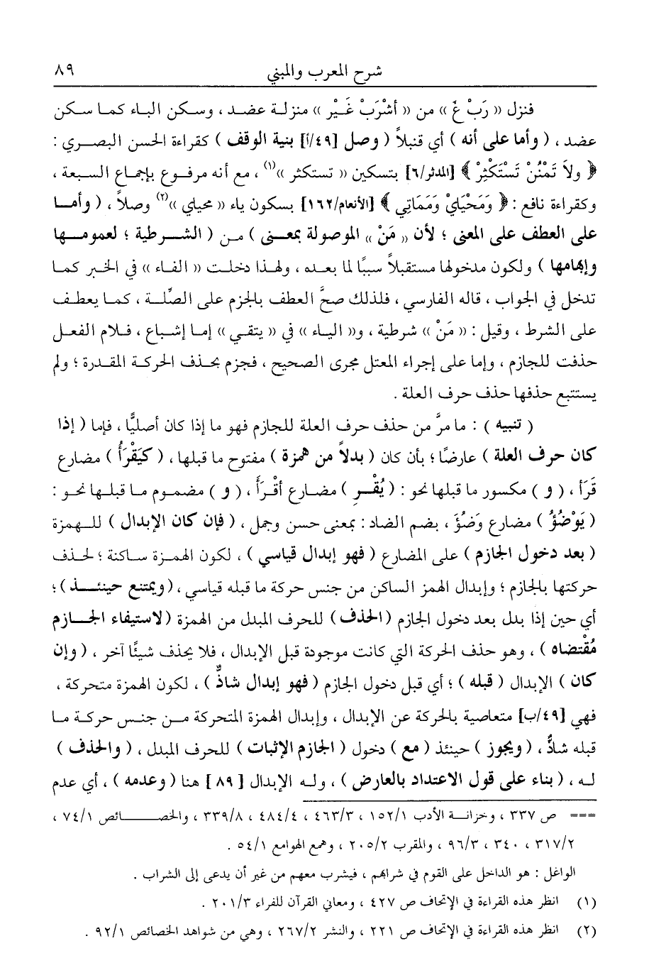 فنزل "رب غ" من "أشرب غير" منزلة عضد، وسكن الباء كما سكن عضد، "وأما على أنه" أي: قنبلا "وصل بنية الوقف" كقراءة الحسن البصري: "وَلا تَمْنُنْ تَسْتَكْثِرْ" [المدثر: 6] بتسكين "تستكثر"1، مع أنه مرفوع بإجماع السبعة، وكقراءة نافع: "وَمَحْيَايْ وَمَمَاتِي" [الأنعام: 162] بسكون ياء "محياي"2 وصلا، "وأما على العطف على المعنى؛ لأن "من" الموصولة بمعنى" من "الشرطية؛ لعمومها وإبهامها" ولكون مدخولها مستقبلا سببا لما بعده، ولهذا دخلت "الفاء" في الخبر كما تدخل في الجواب، قاله الفارسي، فلذلك صح العطف بالجزم على الصلة، كما يعطف على الشرط، وقيل: "من" شرطية، و"الياء" في "يتقي" إما إشباع، فلام الفعل حذفت للجازم، وإما على إجراء المعتل مجرى الصحيح، فجزم بحذف الحركة المقدرة؛ ولم يستتبع حذفها حذف حرف العلة.