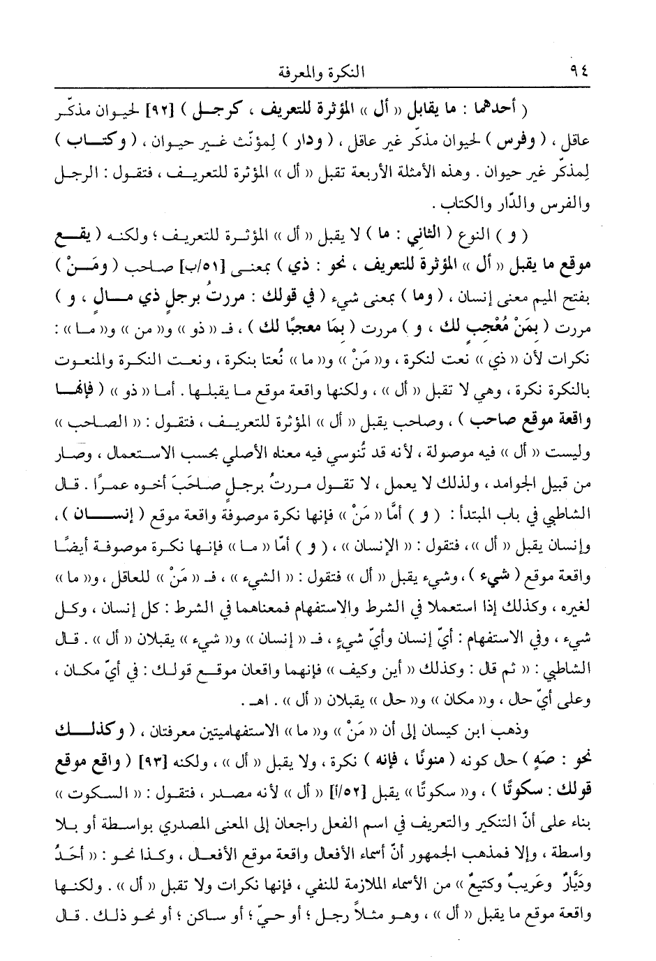 "و" النوع "الثاني: ما" لا يقبل "أل" المؤثرة للتعريف؛ ولكنه "يقع موقع ما يقبل "أل" المؤثرة للتعريف، نحو: ذي" بمعنى صاحب "ومن" بفتح الميم معنى إنسان، "وما" بمعنى شيء "في قولك: مررت برجل ذي مال، و" مررت "بمن معجب لك، و" مررت "بما معجبا لك"، فـ"ذو" و"من" و"ما": نكرات لأن "ذي" نعت لنكرة، و"من" و"ما" نُعتا بنكرة، ونعت النكرة والمنعوب بالنكرة نكرة، وهي لا تقبل "أل"، ولكنها واقعة موقع ما يقبلها. أما "ذو" "فإنها واقعة موقع صاحب"، وصاحب يقبل "أل" المؤثرة للتعريف، فتقول: "الصاحب" وليست "أل" فيه موصولة؛ لأنه قد تنوسي فيه معناه الأصلي بحسب الاستعمال، وصار من قبيل الجوامد، ولذلك لا يعمل، لا تقول مررت برجل صاحب أخوه عمرا. قال الشاطبي في باب المبتدأ: "و" أما "من" فإنها نكرة موصوفة واقعة موقع "إنسان"، وإنسان يقبل "أل"، فتقول: "الإنسان"، "و" أما "ما" فإنها نكرة موصوفة أيضا واقعة موقع "شيء"، وشيء يقبل "أل" فتقول: "الشيء"، فـ"من" للعاقل، و"ما" لغيره، وكذلك إذا استعملا في الشرط والاستفهام فمعناهما في الشرط: كل إنسان، وكل شيء، وفي الاستفهام، أي إنسان وأي شيء فـ"إنسان" و"شيء" يقبلان "أل". قال الشاطبي: "ثم قال: وكذلك "أين وكيف" فإنهما واقعان موقع قولك: في أي مكان، وعلى أي حال، و"مكان" و"حال" يقبلان "أل". ا. هـ.
