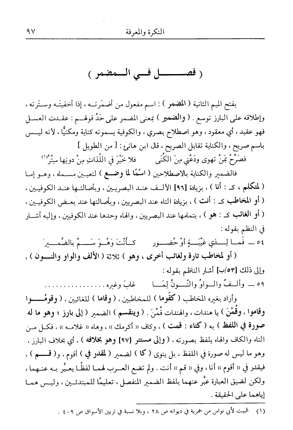 بفتح الميم الثانية "المضمر": اسم مفعول من أضمرته، إذا أخفيته وسترته، وإطلاقه على البارز توسع. "والضمير" بمعنى المضمر على حد قولهم: عقدت العسل فهو عقيد، أي: معقود، وهو اصطلاح بصري، والكوفية يسمونه كناية ومكنيًّا؛ لأنه ليس باسم صريح، والكناية تقابل الصريح، قال ابن هانئ: [من الطويل]