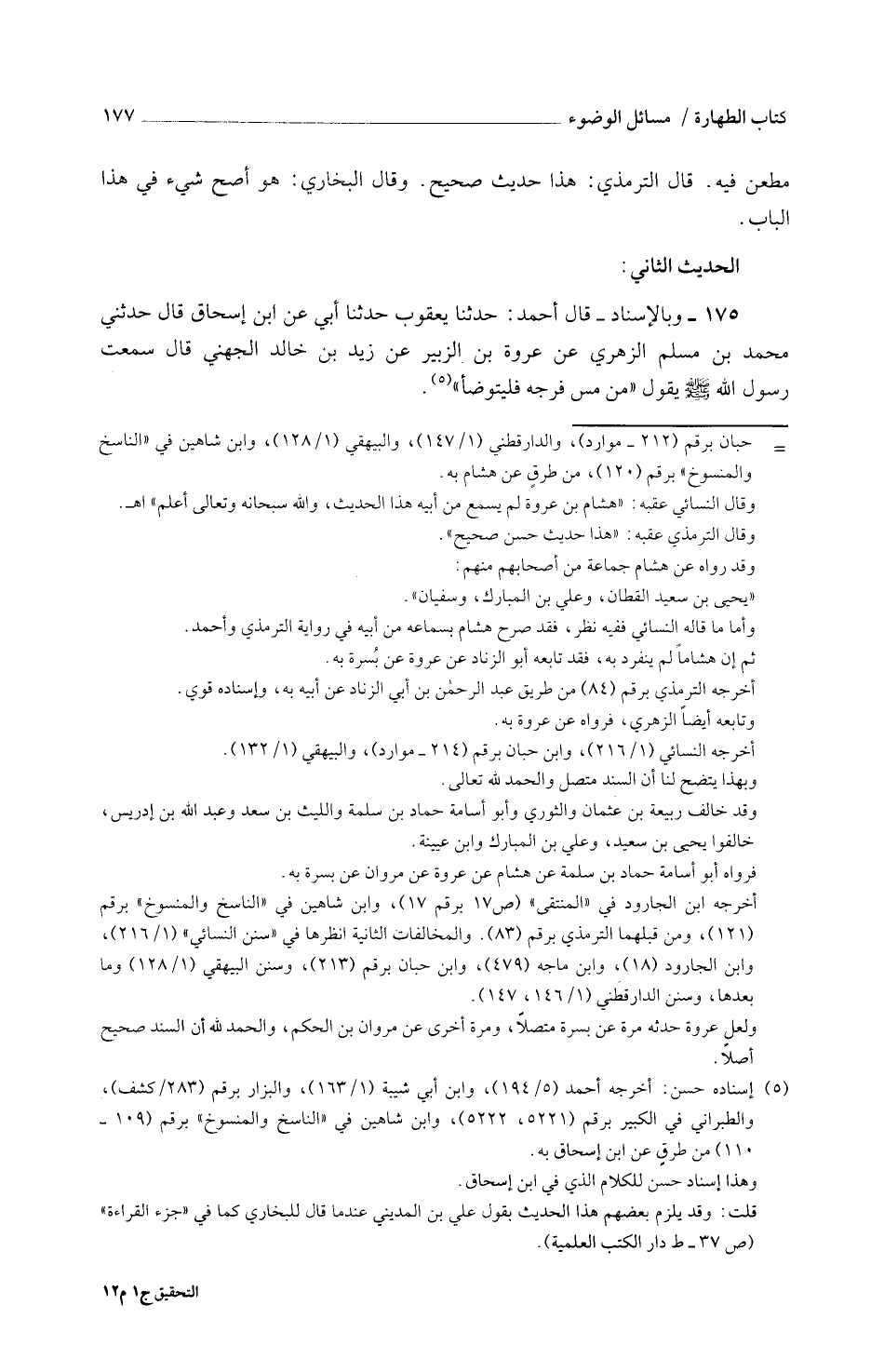 175 - وبِالْإِسْنَادِ قَالَ أَحْمَدُ حَدَّثَنَا يَعْقُوبُ حَدَّثَنَا أَبِي عَنِ ابْنِ إِسْحَاقَ قَالَ حَدَّثَنِي مُحَمَّدُ بْنُ مُسْلِمٍ الزُّهْرِيُّ عَنْ عُرْوَةَ بْنِ الزُّبَيْرِ عَنْ زَيْدِ بْنِ خَالِدٍ الْجُهَنِيُّ قَالَ سَمِعْتُ رَسُولَ اللَّهِ صَلَّى اللَّهُ عَلَيْهِ وَسَلَّمَ يَقُولُ مَنْ مَسَّ فَرْجَهُ فَلْيَتَوَضَّأْ