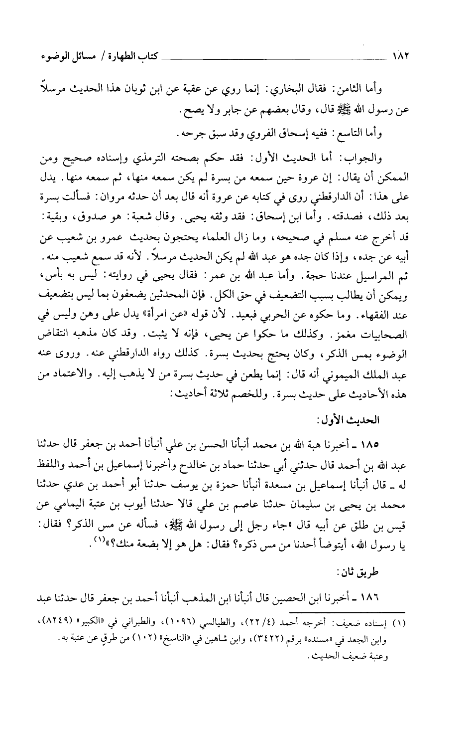 وَالْجَوَابُ أَمَّا الْحَدِيثُ الْأَوَّلُ فَقَدْ حَكَمَ بِصِحَّتِهِ التِّرْمِذِيُّ وَإِسْنَادُهُ صَحِيحٌ وَمِنَ الْمُمْكِنِ أَنْ يُقَالَ إِنَّ عُرْوَةَ حِينَ سَمِعَهُ مِنْ بُسْرَةَ لَمْ يَكُنْ سَمِعَهُ مِنْهَا ثُمَّ سَمِعَهُ مِنْهَا يَدُلُّ عَلَى هَذَا أَنَّ الدَّارَقُطْنِيَّ رَوَى فِي كِتَابِهِ عَنْ عُرْوَةَ أَنَّهُ قَالَ بَعْدَ أَنْ حَدَّثَهُ مَرْوَانُ فَسَأَلْتُ بُسْرَةَ بَعْدَ ذَلِكَ فَصَدَّقَتْهُ وَأَمَّا ابْنُ إِسْحَاقَ فَقَدْ وَثَّقَهُ يَحْيَى وَقَالَ شُعْبَةُ هُوَ صَدُوقٌ وَبَقِيَّةُ قَدْ أَخْرَجَ عَنْهُ مُسْلِمٌ فِي صَحِيحه ومَا زَالَ الْعُلَمَاءُ يَحْتَجُّونَ بِحَدِيثِ عَمْرِو بْنِ شُعَيْبٍ عَنْ أَبِيهِ عَنْ جده وَإِذا كَانَ جده هُوَ عبد اللهلم يَكُنِ الْحَدِيثُ مُرْسَلًا لِأَنَّهُ قَدْ سَمِعَ شُعَيْبٌ مِنْهُ ثُمَّ الْمَرَاسِيلُ عندنَا حجَّة وأما عَبْدُ اللَّهِ بْنُ عُمَرَ فَقَالَ يَحْيَى فِي رِوَايَتِهِ لَيْسَ بِهِ بَأْسٌ وَيُمْكِنُ أَنْ يُطَالَبَ بِسَبَبِ التَّضْعِيفِ فِي حَقِّ الْكُلِّ فَإِنَّ الْمُحَدِّثِينَ يُضَعِّفُونَ بِمَا لَيْسَ بِتَضْعِيفٍ عِنْدَ الْفُقَهَاءِ وَمَا حَكَوْهُ عَنِ الْحَرْبِيِّ فَبَعِيدٌ لِأَنَّ قَوْلَهُ عَنِ امْرَأَةٍ يَدُلُّ عَلَى وَهَنٍ وَلَيْسَ فِي الصحابيات مغمز وكَذَلِك مَا حَكَوْا عَنْ يَحْيَى فَإِنَّهُ لَا يَثْبُتُ وَقَدْ كَانَ مَذْهَبُهُ انْتِقَاض الْوضُوء بِمَسّ الذّكر وكَانَ يَحْتَجُّ بِحَدِيثِ بُسْرَةَ كَذَلِكَ رَوَاهُ الدَّارَقُطْنِيُّ عَنْهُ وَرَوَى عَنْهُ عَبْدُ الْمَلِكِ الْمَيْمُونِيُّ أَنَّهُ قَالَ إِنَّمَا يَطْعَنُ فِي حَدِيثِ بِسْرَةَ مَنْ لَا يَذْهَبُ إِلَيْهِ وَالِاعْتِمَادُ مِنْ هَذِهِ الْأَحَادِيثِ عَلَى حَدِيثِ بُسْرَةَ وَلِلْخَصْمِ ثَلَاثَةُ أَحَادِيثَ