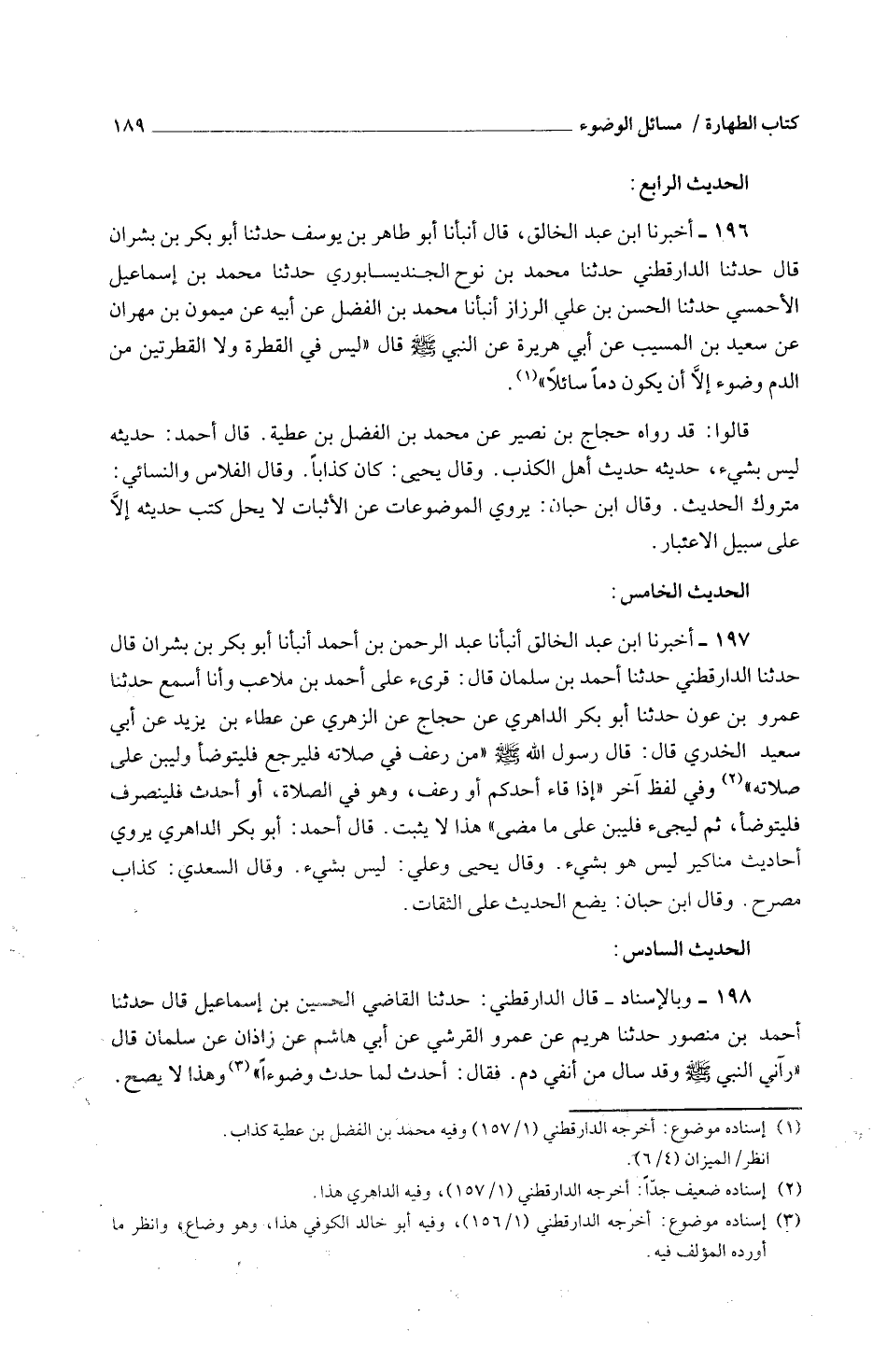 198 - وبِالْإِسْنَادِ قَالَ الدَّارَقُطْنِيُّ حَدَّثَنَا الْقَاضِي الْحُسَيْنُ بْنُ إِسْمَاعِيلَ قَالَ حَدَّثَنَا أَحْمَدُ بْنُ مَنْصُورٍ حَدَّثَنَا هُرَيْمٌ عَنْ عَمْرٍو الْقُرَشِيِّ عَنْ أَبِي هَاشِمٍ عَن رزاذان عَنْ سَلْمَانَ قَالَ رَآنِي النَّبِيُّ صلى الله عَلَيْهِ وسلم وَقَدْ سَالَ مِنْ أَنْفِي دَمٌ فَقَالَ أَحْدِثْ لِمَا حَدَثَ وَضُوءًا وَهَذَا لَا يَصِحُّ