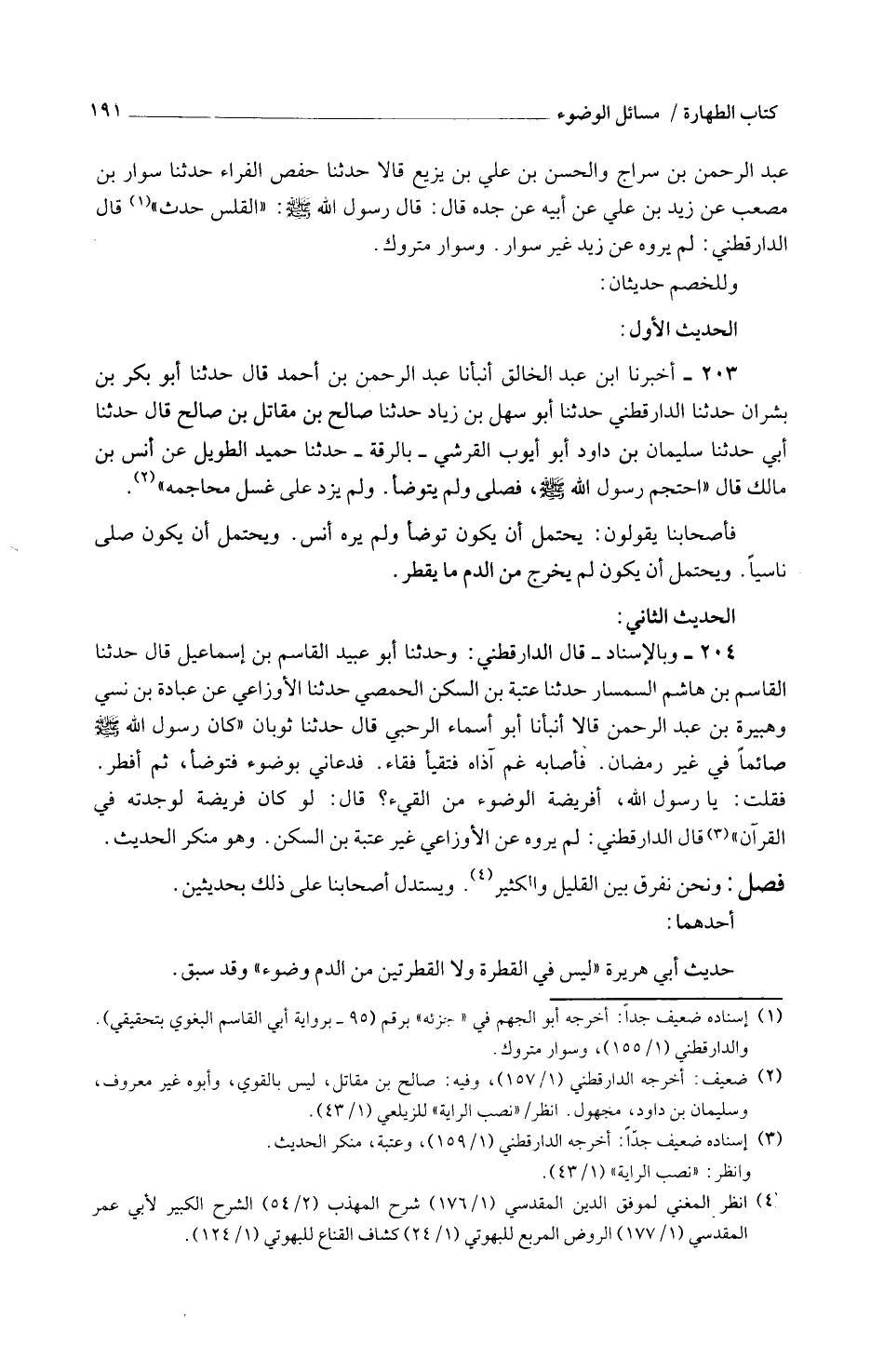 204 - وَبِالْإِسْنَادِ قَالَ الدَّارَقُطْنِيُّ وَحَدَّثَنَا أَبُو عُبَيْدٍ الْقَاسِمُ بْنُ إِسْمَاعِيلَ قَالَ حَدَّثَنَا الْقَاسِمُ بْنُ هَاشِمٍ السِّمْسَارَ حَدَّثَنَا عُتْبَةُ بْنُ السَّكَنِ الْحِمْصِيُّ حَدَّثَنَا الْأَوْزَاعِيُّ عَنْ عُبَادَةُ بْنُ نَسِيٍّ وَهُبَيْرَةُ بْنُ عَبْدِ الرَّحْمَنِ قَالَا أَنْبَأَنَا أَبُو أَسْمَاءَ الرَّحَبِيُّ قَالَ حَدَّثَنَا ثَوْبَانُ كَانَ رَسُولُ اللَّهِ صَلَّى اللَّهُ عَلَيْهِ وَسَلَّمَ صَائِمًا فِي غَيْرِ رَمَضَانَ فَأَصَابَهُ غَمٌّ آذَاهُ فَتَقَيَّأَ فَقَاءَ فَدَعَانِي بِوُضُوءٍ فَتَوَضَّأَ ثُمَّ أَفْطَرَ فَقُلْتُ يَا رَسُولَ اللَّهِ أَفَرِيضَةُ الْوُضُوءِ مِنَ الْقَيْءِ قَالَ لَوْ كَانَ فَرِيضَةً لَوَجَدْتَهُ فِي الْقُرْآنِ قَالَ الدَّارَقُطْنِيُّ لَمْ يَرْوِهِ عَنِ الْأَوْزَاعِيُّ غَيْرُ عُتْبَةَ بْنِ السَّكَنِ وَهُوَ مُنْكَرُ الْحَدِيثِ
