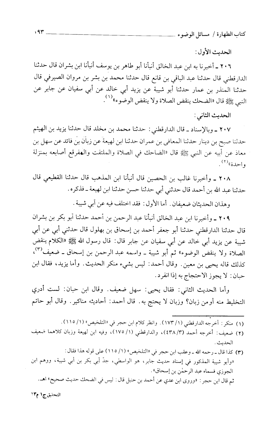 209 - وأَخْبَرَنَا ابْنُ عَبْدِ الْخَالِقِ أَنْبَأَنَا عَبْدُ الرَّحْمَنِ بْنُ أَحْمَدَ حَدَّثَنَا أَبُو بَكْرِ بْنُ بِشْرَانَ قَالَ حَدَّثَنَا الدَّارَقُطْنِيُّ حَدَّثَنَا أَبُو جَعْفَرٍ أَحْمَدُ بْنُ إِسْحَاقَ بْنِ بَهْلُولٍ قَالَ حَدَّثَنِي أَبِي عَنْ أَبِي شَيْبَةَ عَنْ يَزِيدَ أَبِي خَالِدٍ عَنْ أَبِي سُفْيَانَ عَنْ جَابِرٍ قَالَ قَالَ رَسُولُ اللَّهِ صَلَّى اللَّهُ عَلَيْهِ وَسَلَّمَ الْكَلَامُ يَنْقُضُ الصَّلَاةَ وَلَا يَنْقُضُ الْوُضُوءَ ثُمَّ أَبُو شَيْبَةَ وَاسْمُهُ عَبْدُ الرَّحْمَنِ بْنُ إِسْحَاقَ ضَعِيفٌ كَذَلِكَ قَالَه يَحْيَى بْنُ مَعِينٍ وَقَالَ أَحْمَدُ لَيْسَ بِشَيْءٍ مُنْكَرُ الْحَدِيثِ وَأَمَّا يَزِيدُ فَقَالَ ابْنُ حِبَّانَ لَا يَجُوزُ الِاحْتِجَاجُ بِهِ إِذَا انْفَرَدَ