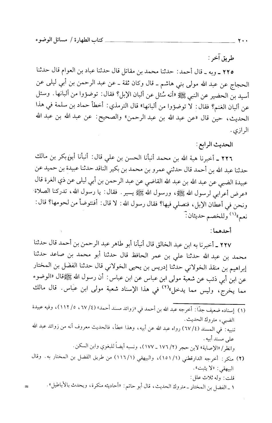 226 - أَخْبَرَنَا هِبَةُ اللَّهِ بْنُ مُحَمَّدٍ أَنْبَأَنَا الْحَسَنُ بْنُ عَلِيٍّ قَالَ أَنْبَأَنَا أَبُو بَكْرِ بْنُ مَالِكٍ حَدَّثَنَا عَبْدُ اللَّهِ بْنُ أَحْمَدَ قَالَ حَدَّثَنِي عَمْرُو بْنُ مُحَمَّدِ بْنِ بُكَيْرٍ النَّاقِدُ حَدَّثَنَا عُبَيْدَةُ بْنُ حُمَيْدٍ عَنْ عُبَيْدَةَ الضَّبِّيِّ عَنْ عَبْدِ اللَّهِ بْنِ عَبْدِ اللَّهِ الْقَاضِي عَنْ عَبْدِ الرَّحْمَنِ بْنِ أَبِي لَيْلَى عَنْ ذِي الْغُرَّةِ قَالَ عَرَضَ أَعْرَابِيٌّ لِرَسُولِ اللَّهِ صَلَّى اللَّهُ عَلَيْهِ وَسَلَّمَ وَرَسُولُ اللَّهِ صَلَّى اللَّهُ عَلَيْهِ وَسَلَّمَ يَسِيرُ فَقَالَ يَا رَسُولَ اللَّهِ تُدْرِكُنَا الصَّلَاةُ وَنَحْنُ فِي أَعْطَانِ الْإِبِلِ فَنُصَلِّي فِيهَا فَقَالَ رَسُولُ اللَّهِ لَا قَالَ أَفَنَتَوَضَّأُ مِنْ لُحُومِهَا قَالَ نَعَمْ وَلِلْخَصْمِ حَدِيثَانِ