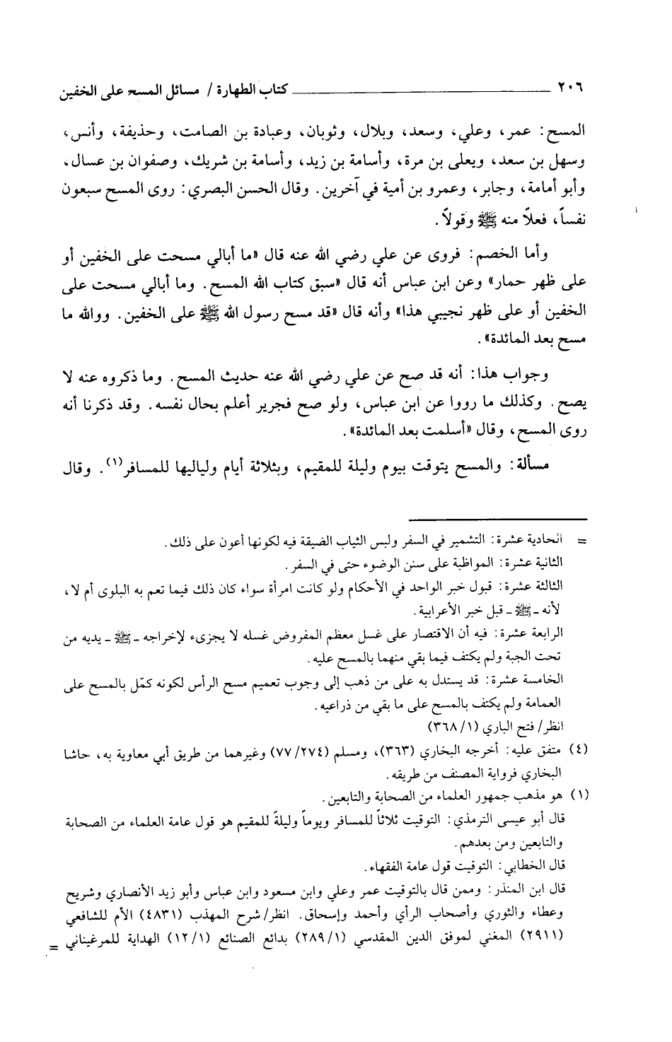 الْمسْح عمر وَعلي وَسعد وبِلَال وثوبان وعبَادَة بن الصَّامِت وَحُذَيْفَة وأنس وسهل بْنُ سَعْدٍ وَيَعْلَى بْنُ مُرَّةَ وَأُسَامَةُ بْنُ زَيْدٍ وَأُسَامَةُ بْنُ شَرِيكٍ وَصَفْوَانُ بْنُ عَسَّالٍ وَأَبُو أُمَامَةَ وَجَابِرٌ وَعَمْرُو بْنُ أُمَيَّةَ فِي آخَرِينَ وَقَالَ الْحَسَنُ الْبَصْرِيُّ رَوَى الْمَسْحَ سَبْعُونَ نَفْسًا فِعْلًا مِنْهُ صلى الله عَلَيْهِ وسلم وقولا