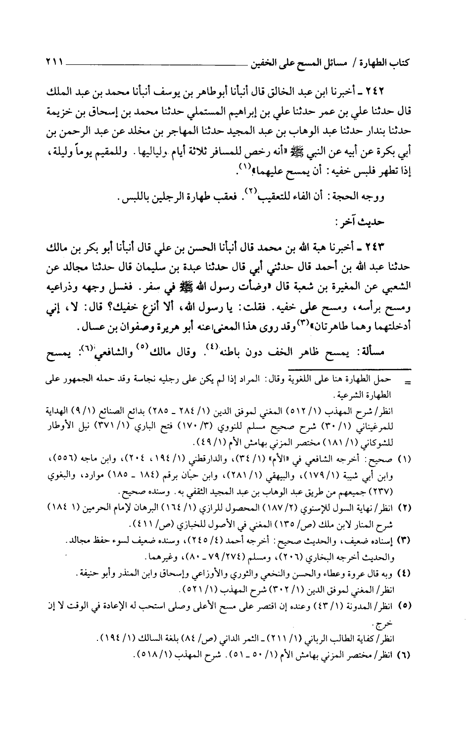 243 - أَخْبَرَنَا هِبَةُ اللَّهِ بْنُ مُحَمَّدٍ قَالَ أَنْبَأَنَا الْحَسَنُ بْنُ عَلِيٍّ قَالَ أَنْبَأَنَا أَبُو بَكْرِ بْنُ مَالِكٍ حَدَّثَنَا عَبْدُ اللَّهِ بْنُ أَحْمَدَ قَالَ حَدَّثَنِي أَبِي قَالَ حَدَّثَنَا عَبْدَةُ بْنُ سُلَيْمَانَ قَالَ حَدَّثَنَا مُجَالِدٌ عَنِ الشَّعْبِيِّ عَنِ الْمُغِيرَةِ بْنِ شُعْبَةَ قَالَ وَضَّأْتُ رَسُولَ اللَّهِ صَلَّى اللَّهُ عَلَيْهِ وَسَلَّمَ فِي سَفَرٍ فَغَسَلَ وَجْهَهُ وَذِرَاعَيْهِ وَمَسَحَ بِرَأْسِهِ وَمَسَحَ عَلَى خُفَّيْهِ فَقُلْتُ يَا رَسُولَ اللَّهِ أَلَا أَنْزِعُ خُفَّيْكَ قَالَ لَا إِنِّي أَدْخَلْتُهُمَا وَهُمَا طَاهِرَتَانِ وَقَدْ رَوَى هَذَا الْمَعْنَى عَنْهُ أَبُو هُرَيْرَةَ وَصَفْوَانُ بْنُ عَسَّالٍ