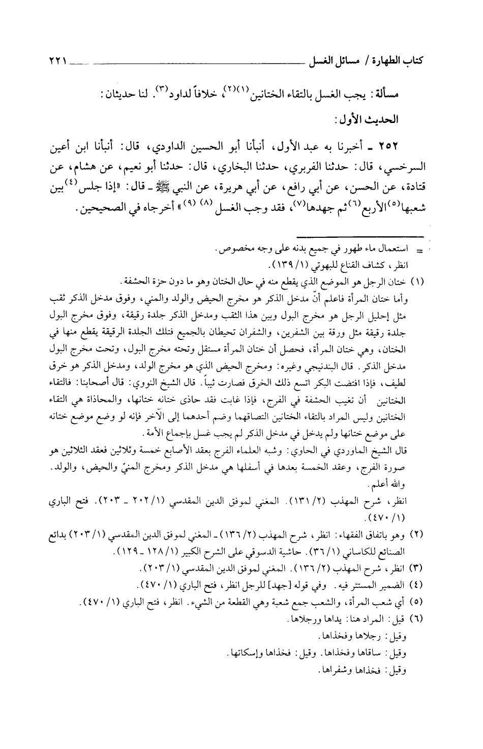252 - أَخْبَرَنَا بِهِ عَبْدُ الْأَوَّلِ أَنْبَأَنَا أَبُو الْحُسَيْنِ الدَّاوُدِيُّ قَالَ أَنْبَأَنَا ابْنُ أَعْيَنَ السَّرْخَسِيُّ قَالَ حَدَّثَنَا الْفَرَبْرِيُّ حَدَّثَنَا الْبُخَارِيُّ قَالَ حَدَّثَنَا أَبُو نُعَيْمٍ عَنْ هِشَامٍ عَنْ قَتَادَةَ عَنِ الْحَسَنِ عَنْ أَبِي رَافِعٍ عَنْ أَبِي هُرَيْرَةَ عَنِ النَّبِيِّ صَلَّى اللَّهُ عَلَيْهِ وَسَلَّمَ قَالَ إِذَا جَلَسَ بَيْنَ شُعَبِهَا الْأَرْبَعِ ثُمَّ جَهَدَهَا فَقَدْ وَجَبَ الْغُسْلُ أَخْرَجَاهُ فِي الصَّحِيحَيْنِ