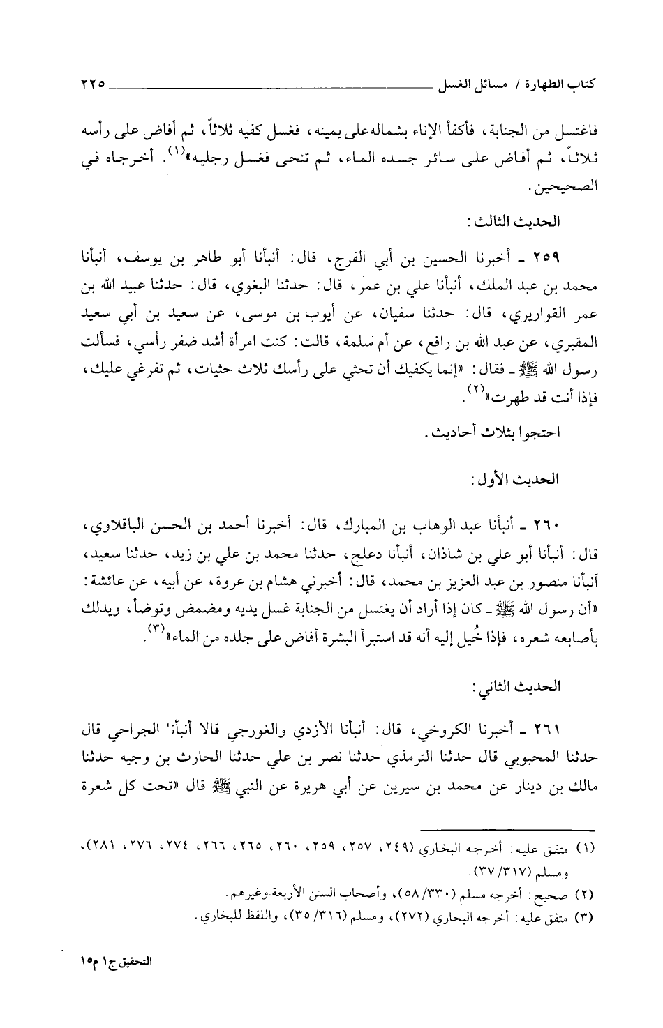 259 - أَخْبَرَنَا الْحُسَيْنُ بْنُ أَبِي الْفَرَجِ قَالَ أَنْبَأَنَا أَبُو طَاهِرِ بْنِ يُوسُفَ أَنْبَأَنَا مُحَمَّدُ بْنُ عَبْدِ الْمَلِكِ أَنْبَأَنَا عَلِيُّ بْنُ عُمَرَ قَالَ حَدَّثَنَا الْبَغَوِيُّ قَالَ حَدَّثَنَا عُبَيْدُ اللَّهِ بْنُ عُمَرَ الْقَوَارِيرِيُّ قَالَ حَدَّثَنَا سُفْيَانُ عَنْ أَيُّوبَ بْنِ مُوسَى عَنْ سَعِيدِ بْنِ أَبِي سَعِيدٍ الْمَقْبُرِيِّ عَنْ عَبْدِ اللَّهِ بْنِ رَافِعٍ عَنْ أُمِّ سَلَمَةَ قَالَتْ كُنْتُ امْرَأَةً أَشُدُّ ضَفْرَ رَأْسِي فَسَأَلْتُ رَسُولَ اللَّهِ صَلَّى اللَّهُ عَلَيْهِ وَسَلَّمَ فَقَالَ إِنَّمَا يَكْفِيكِ أَنْ تَحْثِي عَلَى رَأْسِكِ ثَلَاثَ حَثَيَاتٍ ثُمَّ تُفْرِغِي عَلَيْكِ فَإِذَا أَنْتِ قَدْ طهرت