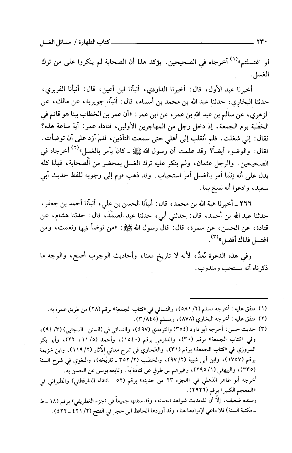 أَخْبَرَنَا عَبْدُ الْأَوَّلِ قَالَ أَخْبَرَنَا الدَّاوُدِيُّ أَنْبَأَنَا ابْنُ أَعْيَنَ قَالَ أَنْبَأَنَا الْفَرَبْرِيُّ حَدَّثَنَا الْبُخَارِيُّ حَدَّثَنَا عَبْدُ اللَّهِ بْنُ مُحَمَّدِ بْنِ أَسْمَاءَ قَالَ أَنْبَأَنَا جُوَيْرِيَّةُ عَنْ مَالِكٍ عَنِ الزُّهْرِيِّ عَنْ سَالِمِ بْنِ عَبْدِ اللَّهِ بْنِ عُمَرَ عَنِ ابْنِ عُمَرَ أَنَّ عُمَرَ بْنَ الْخَطَّابِ بَيْنَا هُوَ قَائِمٌ فِي الْخُطْبَةِ يَوْمَ الْجُمُعَةِ إِذْ دَخَلَ رَجُلٌ مِنَ الْمُهَاجِرِينَ الْأَوَّلِينَ فَنَادَاهُ عُمَرُ أَيَّةُ سَاعَةٍ هَذِهِ فَقَالَ إِنِّي شُغِلْتُ فَلَمْ أَنْقَلِبْ إِلَى أَهْلِي حَتَّى سَمِعْتُ التَّأْذِينَ فَلَمْ أَزِدْ عَلَى أَنْ تَوَضَّأْتُ فَقَالَ وَالْوُضُوءَ أَيْضًا وَقَدْ عَلِمْتَ أَنّ رَسُولَ اللَّهِ صَلَّى اللَّهُ عَلَيْهِ وَسَلَّمَ كَانَ يَأْمُرُ بِالْغُسْلِ أَخْرجَاهُ فِي الصَّحِيحَيْنِ والرجل عُثْمَانُ وَلَمْ يُنْكِرْ عَلَيْهِ تَرْكَ الْغُسْلِ بِمَحْضَرٍ مِنَ الصَّحَابَةِ فَهَذَا كُلُّهُ يَدُلُّ عَلَى أَنَّهُ إِنَّمَا أَمَرَ بِالْغُسْلِ أَمْرَ اسْتِحْبَابٍ وَقَدْ ذَهَبَ قَوْمٌ إِلَى وُجُوبِهِ لِلَفْظِ حَدِيثِ أَبِي سَعِيدٍ وَادَّعَوْا أَنَّهُ نُسِخَ بِمَا