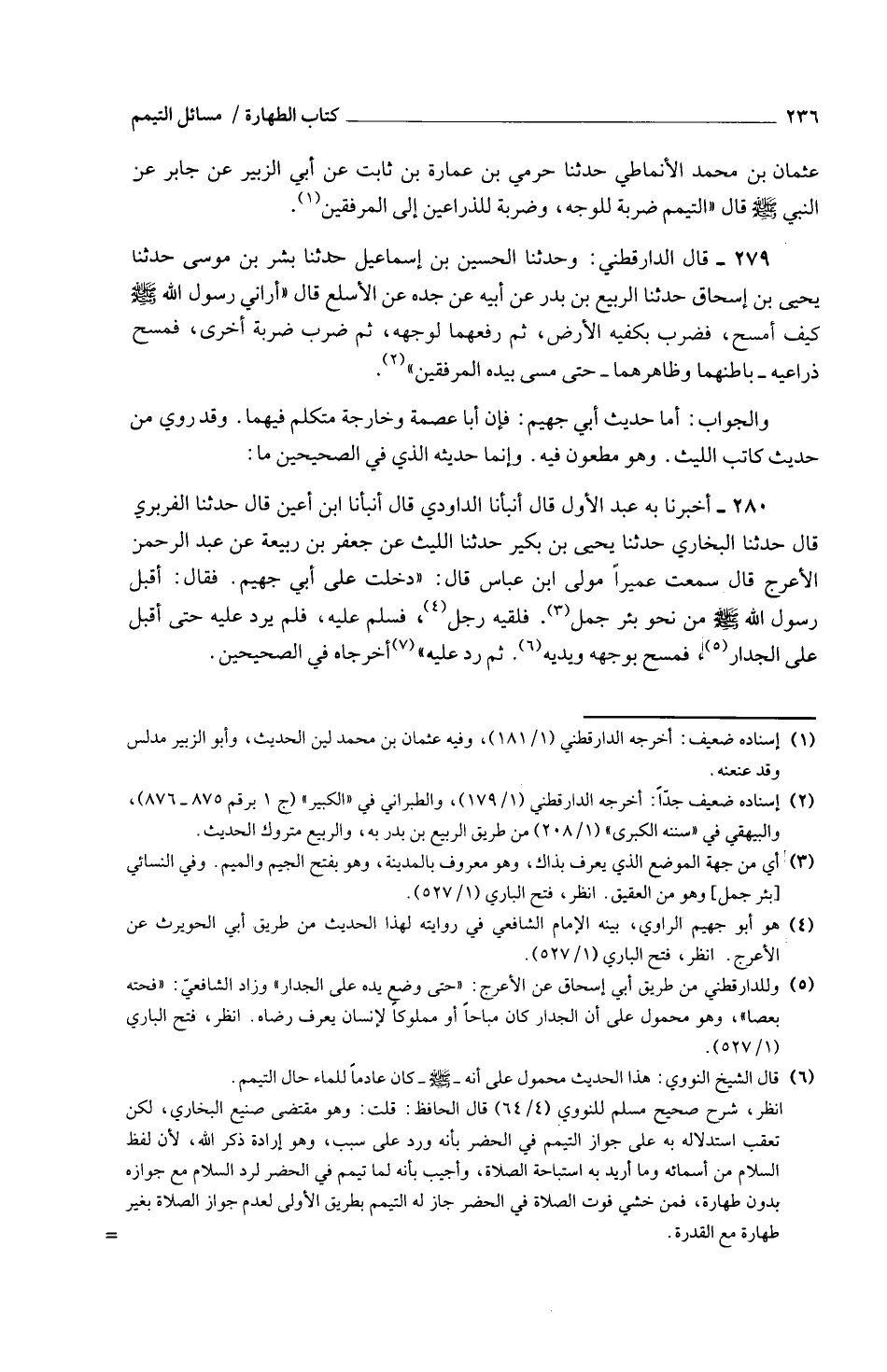 279 - قَالَ الدَّارَقُطْنِيُّ وَحَدَّثَنَا الْحُسَيْنُ بْنُ إِسْمَاعِيلَ حَدَّثَنَا بِشْرُ بْنُ مُوسَى حَدَّثَنَا يَحْيَى بْنُ إِسْحَاقَ حَدَّثَنَا الرَّبِيعُ بْنُ بَدْرٍ عَنْ أَبِيهِ عَنْ جَدِّهِ عَنِ الْأَسْلَعِ قَالَ أَرَانِي رَسُولُ اللَّهِ صَلَّى اللَّهُ عَلَيْهِ وَسَلَّمَ كَيْفَ أَمْسَحُ فَضَرَبَ بِكَفَّيْهِ الْأَرْضَ ثُمَّ رَفَعَهُمَا لِوَجْهِهِ ثُمَّ ضَرَبَ ضَرْبَةً أُخْرَى فَمَسَحَ ذِرَاعَيْهِ بَاطِنَهُمَا وَظَاهِرَهُمَا حَتَّى مَسَّ بِيَدِهِ الْمِرْفَقَيْنِ