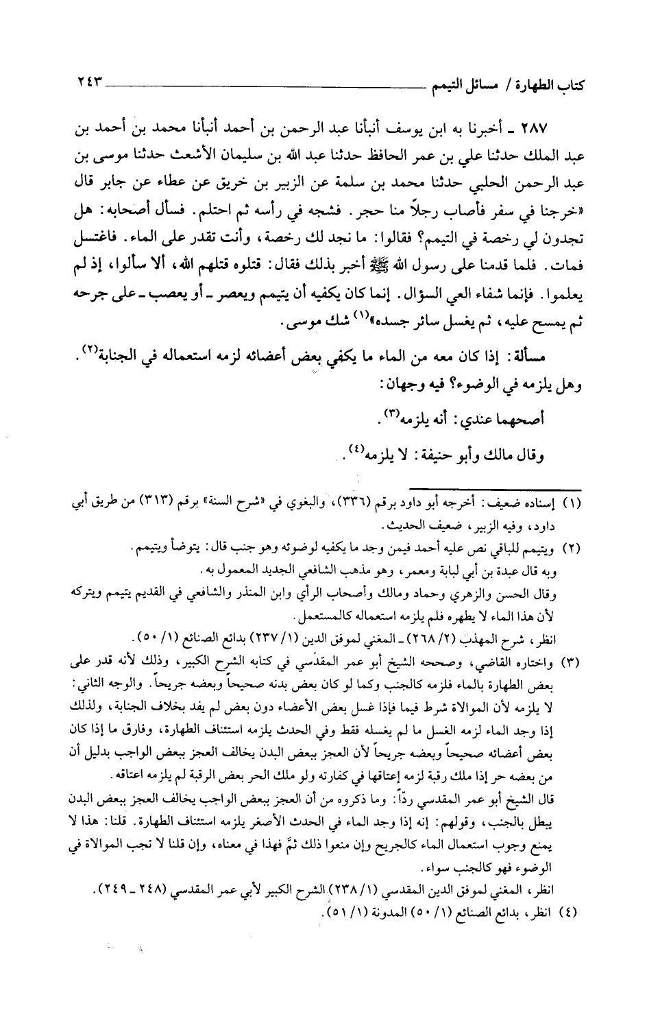 287 - أَخْبَرَنَا بِهِ ابْنُ يُوسُفَ أَنْبَأَنَا عَبْدُ الرَّحْمَنِ بْنُ أَحْمَدَ أَنْبَأَنَا مُحَمَّدُ بْنُ أَحْمَدَ بْنِ عَبْدِ الْمَلِكِ حَدَّثَنَا عَلِيُّ بْنُ عُمَرَ الْحَافِظُ حَدَّثَنَا عَبْدُ اللَّهِ بْنُ سُلَيْمَانَ الْأَشْعَثُ حَدَّثَنَا مُوسَى بْنُ عَبْدِ الرَّحْمَنِ الْحَلَبِيُّ حَدَّثَنَا مُحَمَّدُ بْنُ سَلَمَةَ عَنِ الزُّبَيْرِ بْنِ خُرَيْقٍ عَنْ عَطَاءٍ عَنْ جَابِرٍ قَالَ خَرَجْنَا فِي سَفَرٍ فَأَصَابَ رَجُلًا مِنَّا حَجَرٌ فَشَجَّهُ فِي رَأْسِهِ ثُمَّ احْتَلَمَ فَسَأَلَ أَصْحَابَهُ هَلْ تَجِدُونَ لِي رُخْصَةً فِي التَّيَمُّمِ فَقَالُوا مَا نَجِدُ لَكَ رُخْصَةً وَأَنْتَ تَقْدِرُ عَلَى الْمَاءِ فَاغْتَسَلَ فَمَاتَ فَلَمَّا قَدِمْنَا عَلَى رَسُولُ اللَّهِ صَلَّى اللَّهُ عَلَيْهِ وَسَلَّمَ أُخْبِرَ بِذَلِكَ فَقَالَ قَتَلُوهُ قَتَلَهُمُ اللَّهُ أَلَا سَأَلُوا إِذْ لَمْ يَعْلَمُوا فَإِنَّمَا شِفَاءُ الْعَيِّ السُّؤَالُ إِنَّمَا كَانَ يَكْفِيهِ أَنْ يتَيَمَّم ويعصر أَوْ يَعْصِبَ عَلَى جُرْحِهِ ثُمَّ يَمْسَحَ عَلَيْهِ ثُمَّ يَغْسِلَ سَائِرَ جَسَدِهِ شَكَّ مُوسَى