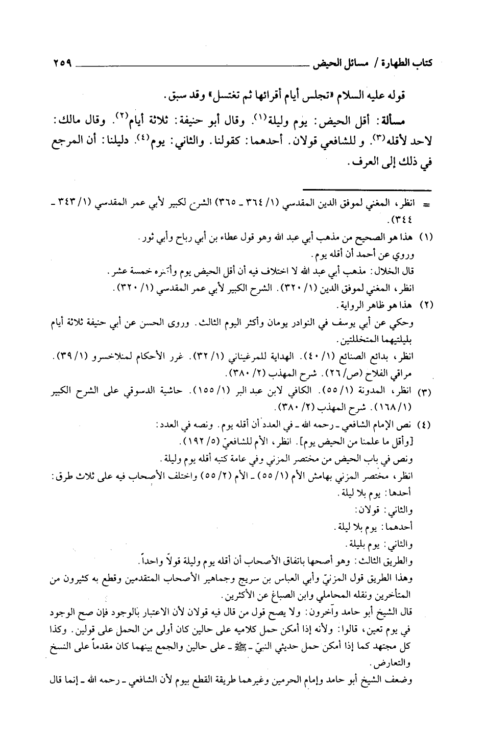 مَسْأَلَةٌ أَقَلُّ الْحَيْضِ يَوْمٌ وَلَيْلَةٌ وَقَالَ أَبُو حَنِيفَةَ ثَلَاثَةُ أَيَّامٍ وَقَالَ مَالِكٌ لَا حَدَّ لِأَقَلِّهِ وللشَّافِعِيّ قَولَانِ أَحدهمَا كَقَوْلِنَا والثَّانِي يَوْم دليلنا أَنَّ الْمَرْجِعَ فِي ذَلِكَ إِلَى الْعُرْفِ