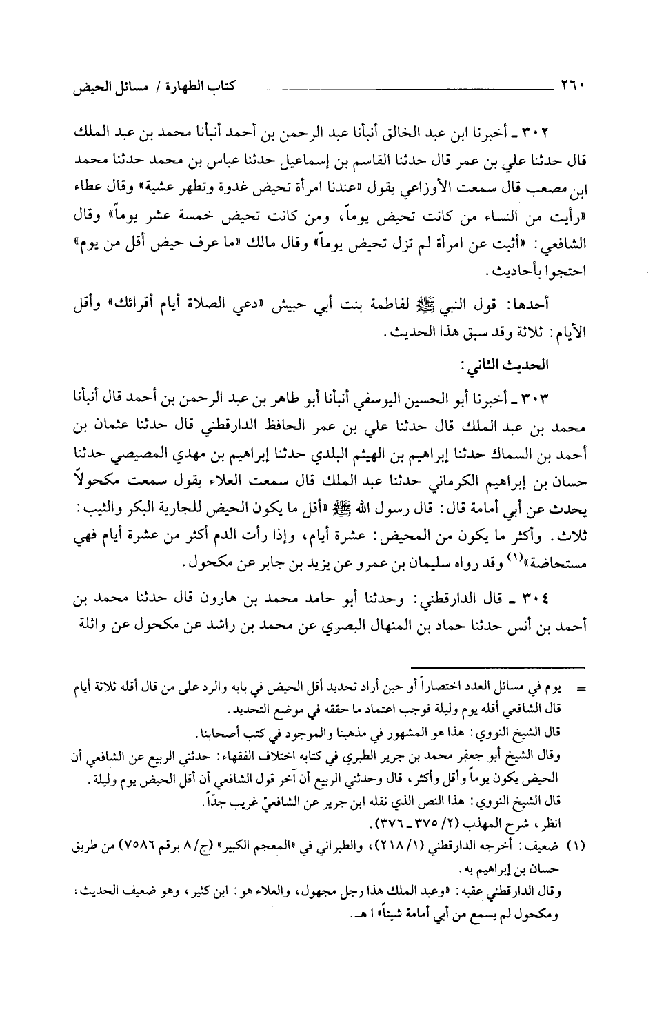 303 - أَخْبَرَنَا أَبُو الْحُسَيْنِ الْيُوسُفِيُّ أَنْبَأَنَا أَبُو طَاهِرِ بْنُ عَبْدِ الرَّحْمَنِ بْنِ أَحْمَدَ قَالَ أَنْبَأَنَا مُحَمَّدُ بْنُ عَبْدِ الْمَلِكِ قَالَ حَدَّثَنَا عَلِيُّ بْنُ عُمَرَ الْحَافِظُ الدَّارَقُطْنِيُّ قَالَ حَدَّثَنَا عُثْمَانُ بْنُ أَحْمَدَ بْنِ السَّمَّاكِ حَدَّثَنَا إِبْرَاهِيمُ بْنُ الْهَيْثَمِ الْبَلَدِيُّ حَدَّثَنَا إِبْرَاهِيمُ بْنُ مَهْدِيٍّ الْمِصِّيصِيُّ حَدَّثَنَا حَسَّانُ بْنُ إِبْرَاهِيمَ الْكَرْمَانِيُّ حَدَّثَنَا عَبْدُ الْمَلِكِ قَالَ سَمِعْتُ الْعَلَاءَ يَقُولُ سَمِعْتُ مَكْحُولًا يُحَدِّثُ عَنْ أَبِي أُمَامَةَ قَالَ قَالَ رَسُولُ اللَّهِ صَلَّى اللَّهُ عَلَيْهِ وَسَلَّمَ أَقَلُّ مَا يَكُونَ الْحَيْضُ لِلْجَارِيَةِ الْبكر والثّيّب ثَلَاثٌ وَأَكْثَرُ مَا يَكُونُ مِنَ الْمَحِيض عشرَة أَيَّام وإِذا رَأَتِ الدَّمَ أَكْثَرَ مِنْ عَشَرَةِ أَيَّامٍ فَهِيَ مُسْتَحَاضَةٌ وَقَدْ رَوَاهُ سُلَيْمَانُ بْنُ عَمْرٍو عَنْ يَزِيدَ بْنِ جَابِرٍ عَنْ مَكْحُولٍ